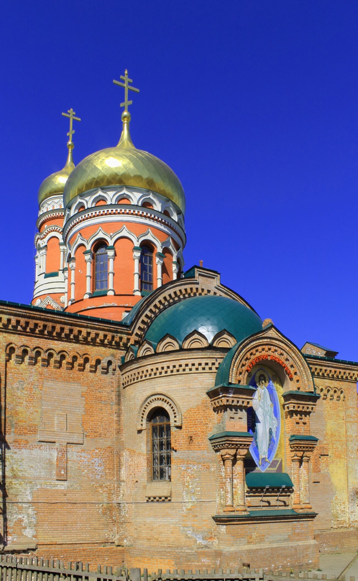 Величественный образ храма складывается из монументальных кирпичных стен, украшенных традиционным для православной архитектуры декором. Взгляд невольно устремляется ввысь, к сияющим на солнце златым главам, увенчанным крестами, символизирующими победу жизни над смертью. На переднем плане виден изящный зелёный купол, расположенный над входной группой или одним из приделов, добавляющий в общую композицию особый колорит и завершённость.