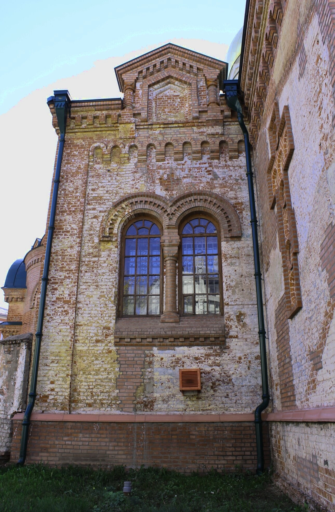 Кирпичная кладка демонстрирует высокое мастерство русских зодчих. Особый интерес представляют арочные окна с металлическими переплетами, объединенные изящным декоративным наличником в форме подковы. Справа от окон просматривается сложный кирпичный декор, включающий аркатурные пояса и элементы, напоминающие традиционные кокошники. Эти архитектурные детали характерны для храмового строительства XVII-XIX веков и отражают преемственность традиций древнерусского зодчества.