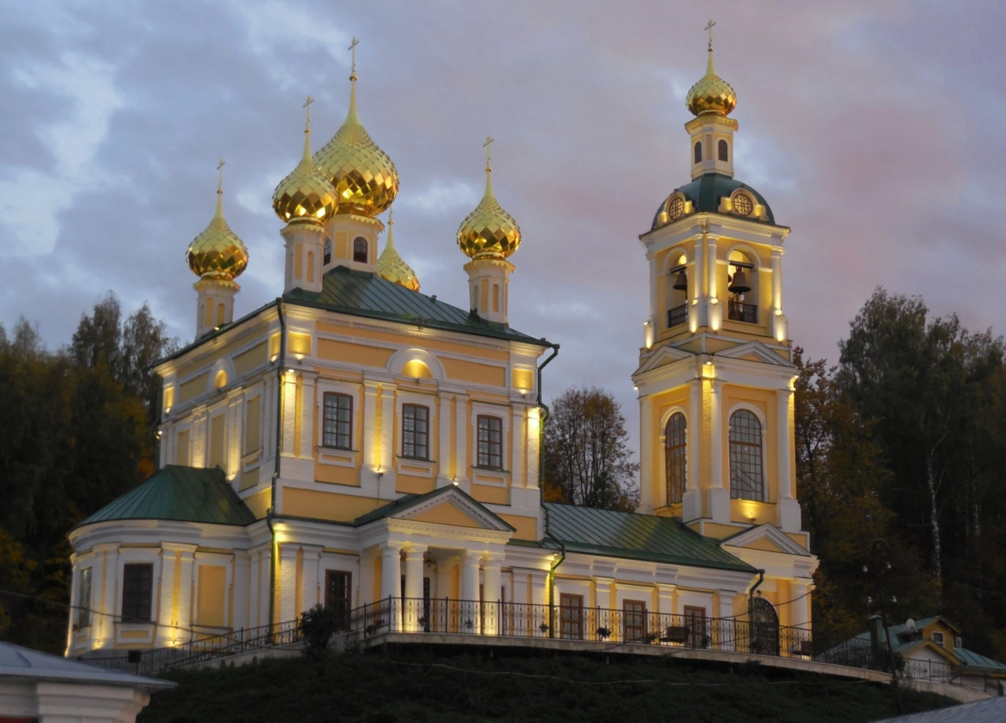 На фотографии запечатлена Церковь Воскресения Христова, расположенная в историческом городе Плёс на Волге. Величественный православный храм возвышается на горе Левитана, откуда открывается живописный вид на речные просторы. Снимок сделан в вечернее время, когда искусная подсветка мягко выхватывает из темноты светлые стены и сияние золотых куполов, создавая атмосферу благоговения и покоя.