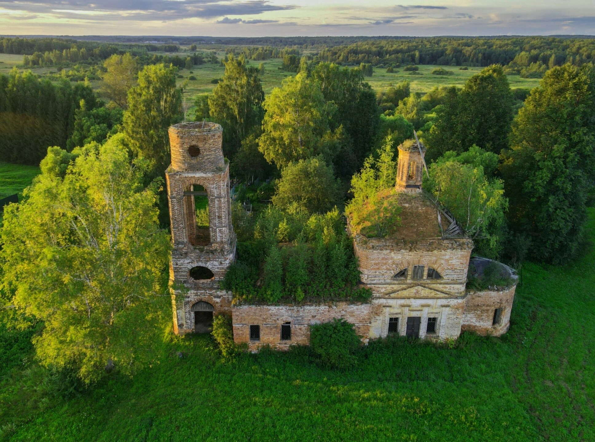 На представленной фотографии запечатлена Церковь Воскресения Христова, расположенная в селе Афанасьево Владимирской области. Этот некогда величественный православный храм ныне пребывает в полуразрушенном состоянии, будучи окружённым густой растительностью и дремучим лесом, что придаёт ему особый, скорбный и в то же время величественный вид.