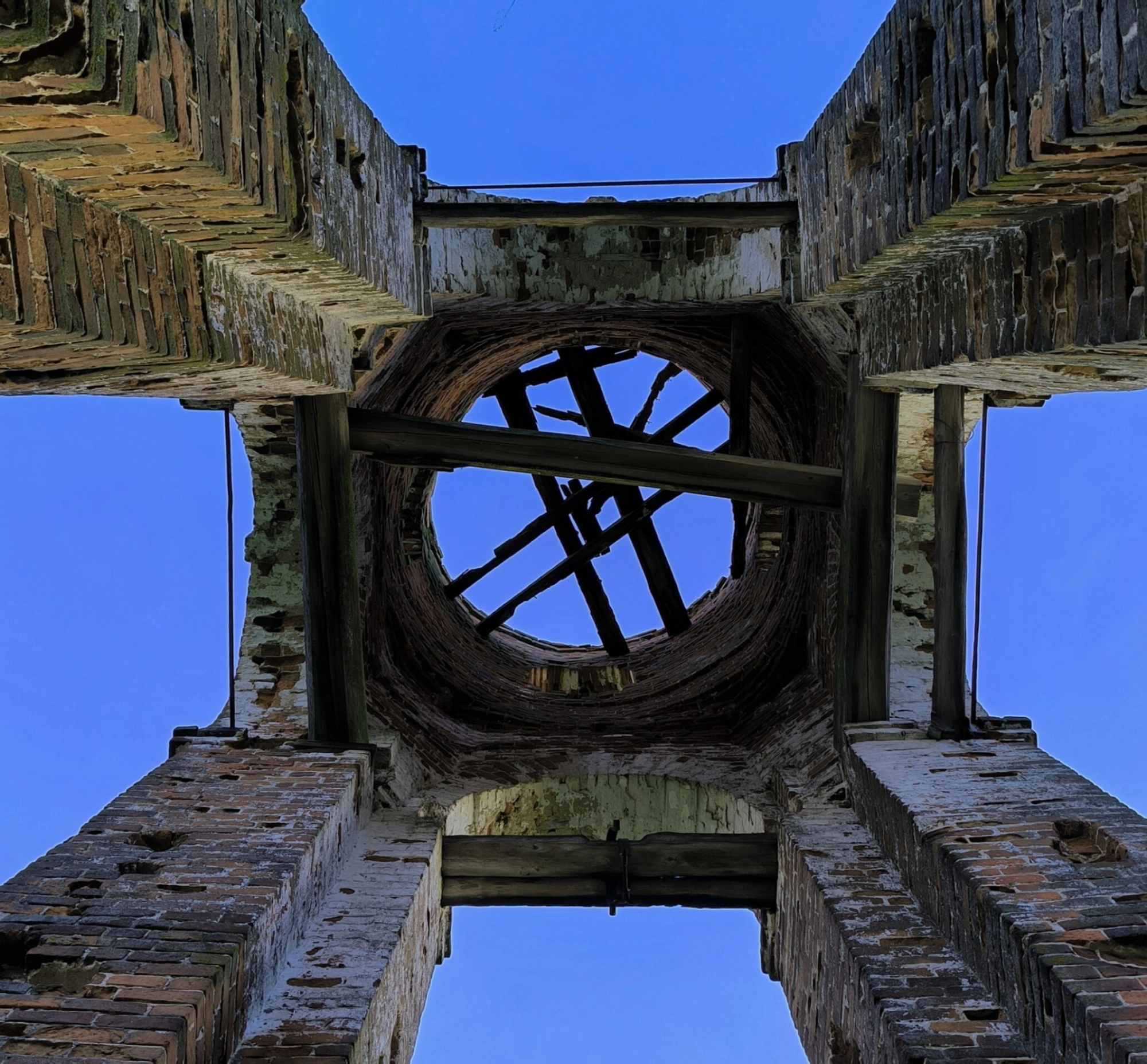 На представленной фотографии запечатлён уникальный вид внутреннего пространства колокольни храма Воскресения Христова, что располагается в селе Афанасьево Ивановской области. Снимок сделан снизу вверх, открывая взору величественную перспективу архитектурного сооружения, устремлённого в небесную высь. Сквозь повреждённый купол или отверстие в кровле проникает естественный свет, символически освещая каменные стены, хранящие память о былом благолепии. Данный ракурс позволяет оценить монументальность конструкции и мастерство зодчих, воплотивших в камне идею духовного восхождения.