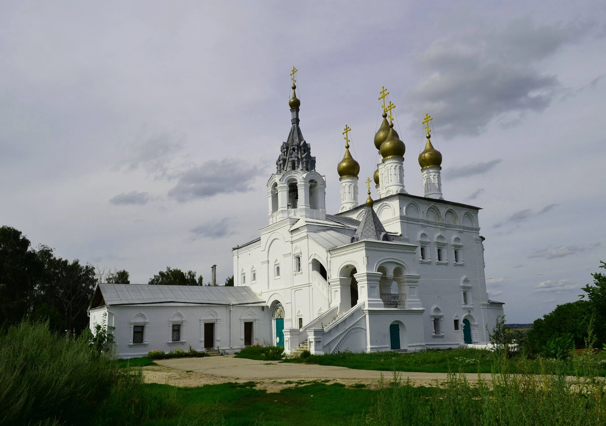 На фотографии запечатлена Церковь Воскресения Христова в селе Исады Рязанской области – действующий православный храм, памятник архитектуры XVII века. Белоснежное здание представляет собой двухэтажный четверик, увенчанный пятью золочёными главами с крестами. Фасад украшен арочными окнами с наличниками, лопатками и поясом ложных кокошников. Слева к основному объёму примыкает шатровая колокольня с тёмным куполом, а справа – одноэтажные пристройки под серыми кровлями. К главному входу ведёт белокаменная лестница с перилами, сами двери окрашены в зелёный цвет. На переднем плане видна грунтовая дорога и густая трава, на заднем – деревья и кустарники. Небо покрыто серыми облаками, что подчёркивает чистоту белых стен храма.