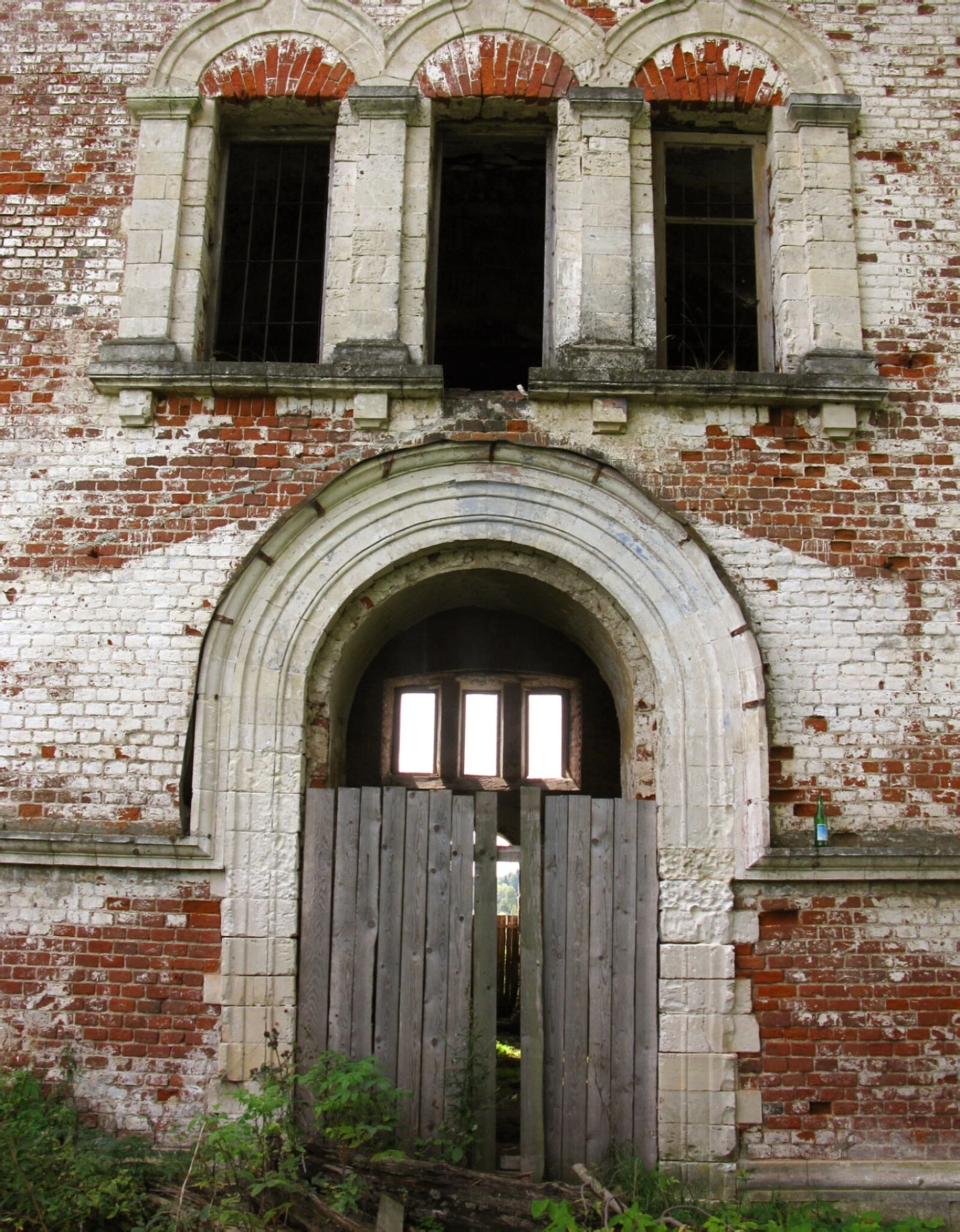 На представленной фотографии запечатлён южный фасад Церкви Воскресения Христова, расположенной в селе Ивойлово Московской области. Храм был возведён в 1860 году в характерном для того периода кирпичном стиле, с минимальным использованием штукатурных декоративных элементов.
