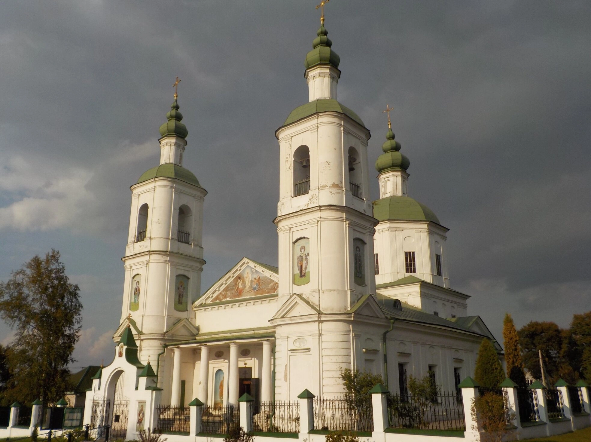Белоснежное каменное здание храма эффектно выделяется на фоне драматичного пасмурного неба, создавая возвышенный и торжественный образ. Архитектурный ансамбль слагается из центрального объёма, увенчанного зелёными куполами, и двух стройных колоколен, также завершающихся изящными зелёными главками со шпилями. Подобное композиционное решение характерно для традиционного русского храмового зодчества и придает строению гармоничную завершённость.