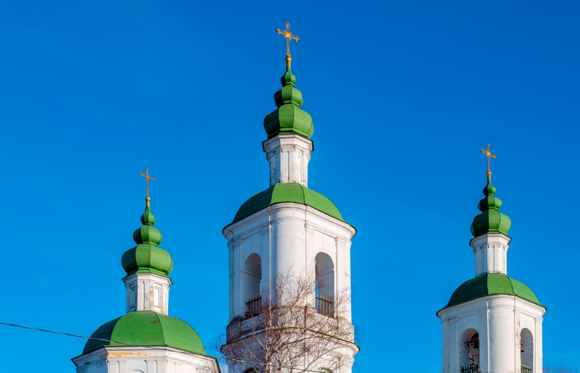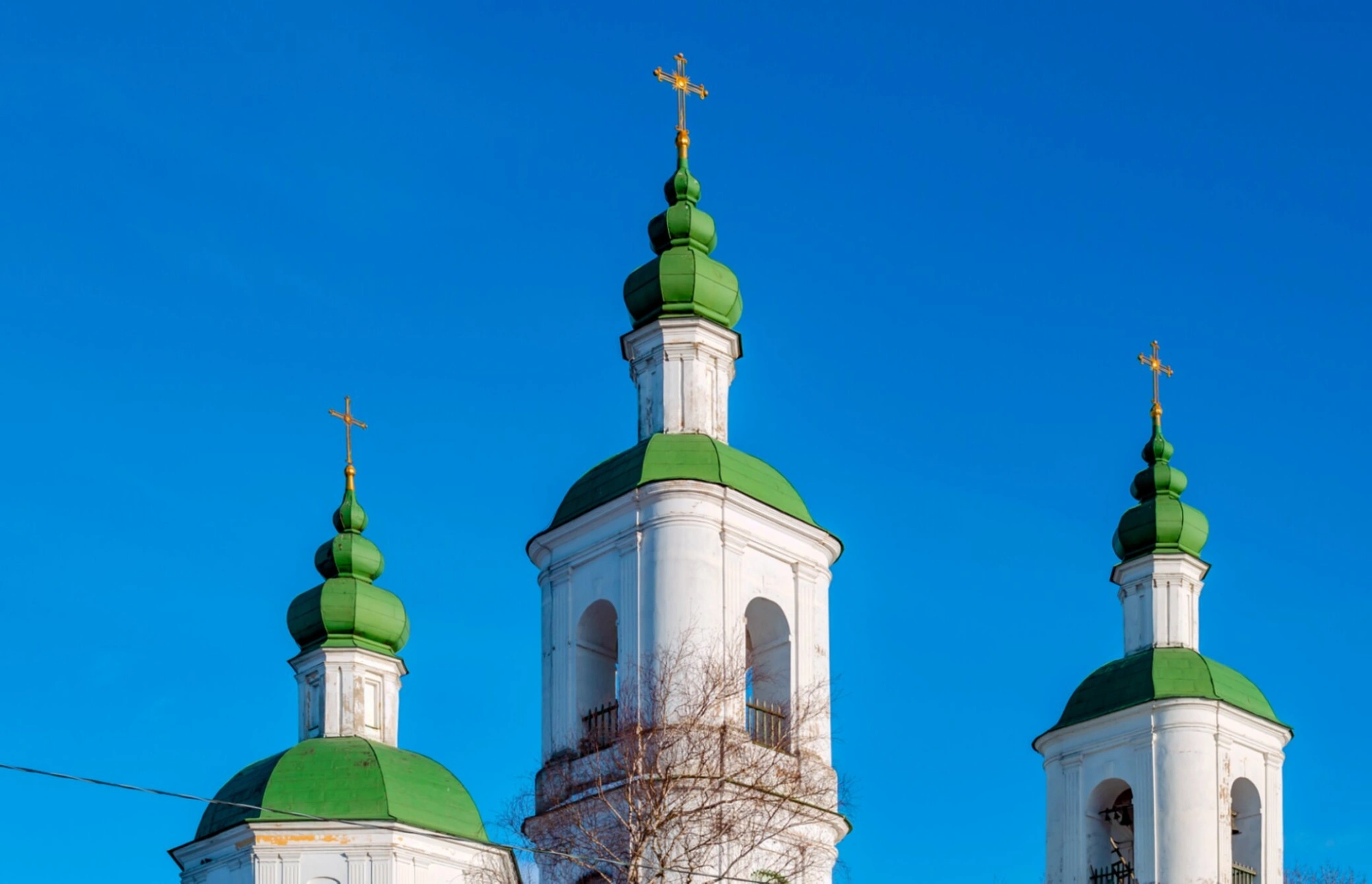 Каждый крест, венчающий купол, является восьмиконечным православным крестом, выполненным с соблюдением канонов. Его золотое сияние свидетельствует о победе Христа над смертью и о heavenly славе. Зелёный цвет глав символически указывает на Пресвятую Духа, животворящую силу, и надежду на вечное обновление.