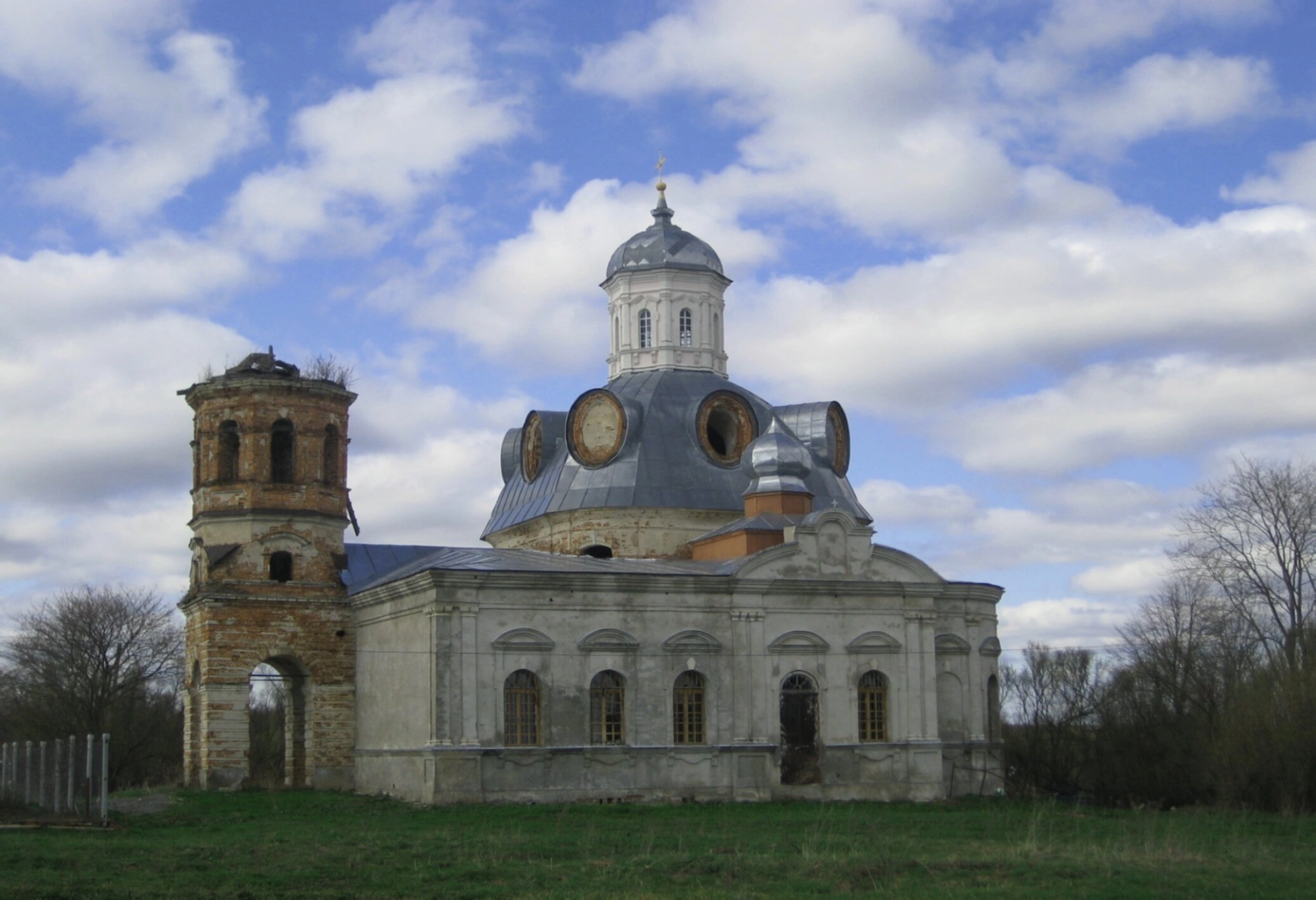 Здание церкви высится на открытой местности, среди полей и редких деревьев, под возвышающимся над ним чистым небом с облаками. Несмотря на повреждения, сооружение сохранило свои основные архитектурные формы: четверик основного объёма, завершающийся мощным световым барабаном и традиционной главкой с крестом, а также колокольню, которая является неотъемлемой частью храмового комплекса.