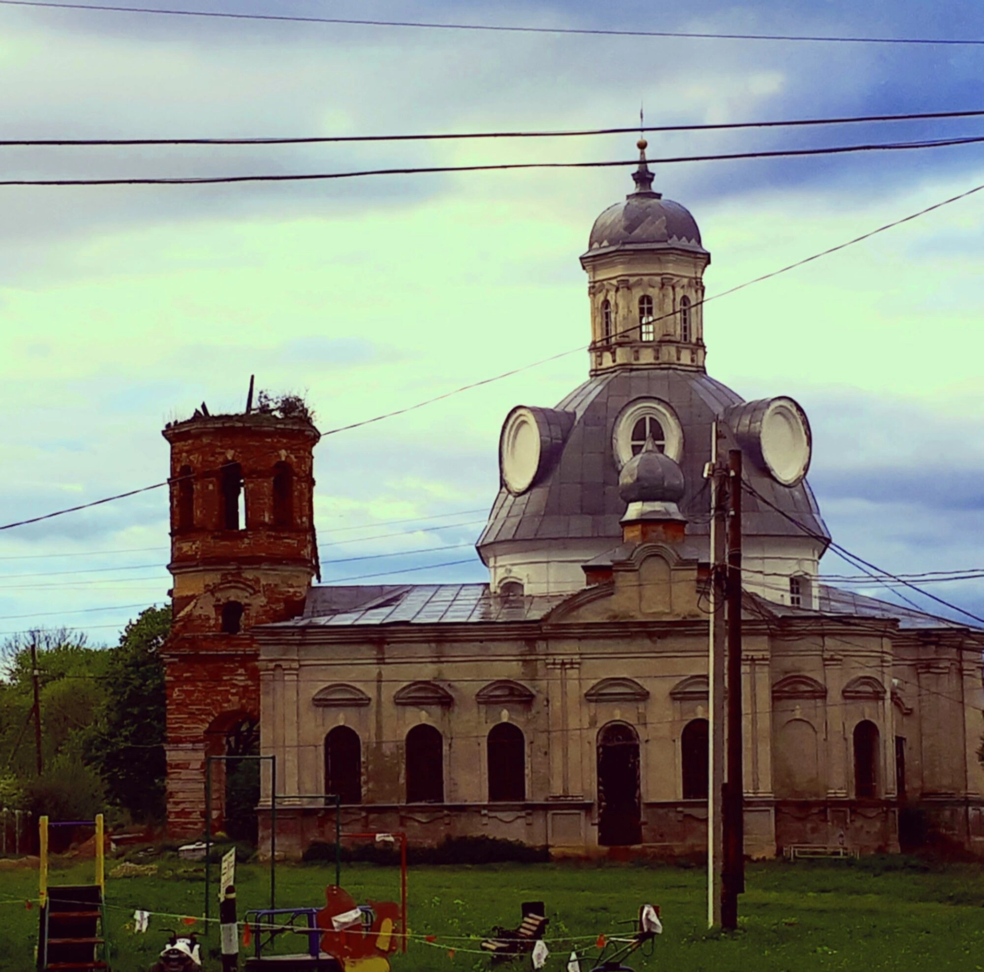 На снимке храм предстаёт во всей своей архитектурной полноте. Центральное место композиции занимает массивный четверик, увенчанный величественным куполом, на котором установлен небольшой изящный шпиль. С западной стороны к основному объёму примыкает колокольня, выполненная из красного кирпича, к сожалению, частично разрушенная временем. Фасад храма украшают арочные оконные проёмы, характерные для церковного зодчества середины XVIII столетия.