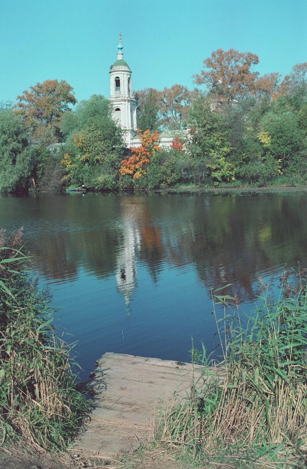 На представленной фотографии запечатлена Церковь Воскресения Христова, расположенная в селе Шипулино Клинского района Московской области. Храм стоит на живописном берегу водоема, отражаясь в его спокойных водах вместе с окружающими деревьями.