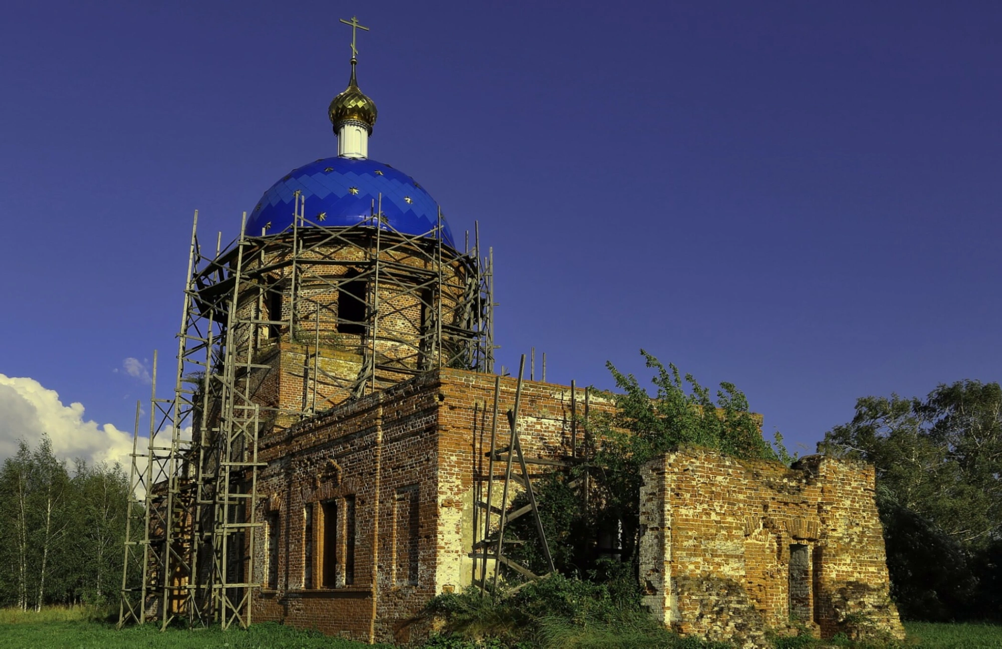 На представленной фотографии запечатлена Церковь Воскресения Христова, расположенная в селе Зернилово Тейковского района Ивановской области. Храм, возведённый из красного кирпича, является ярким образцом русского церковного зодчества. В момент съёмки святыня находится в благодатный период реставрационных работ, о чём красноречиво свидетельствуют установленные строительные леса вокруг купола и части стен.