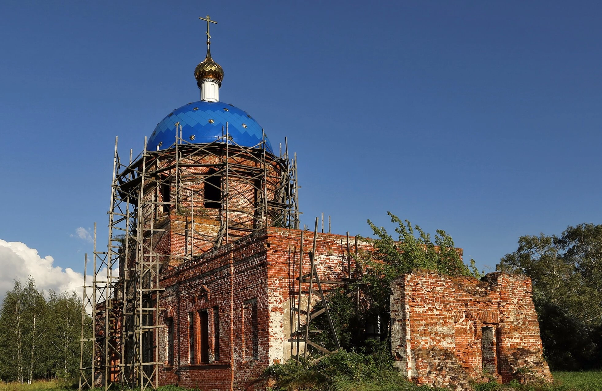 На фотографии запечатлена Церковь Воскресения Христова, расположенная в селе Зернилово Тейковского района. Храм находится на активной стадии восстановления, что символизирует возрождение православной духовности в этом крае.