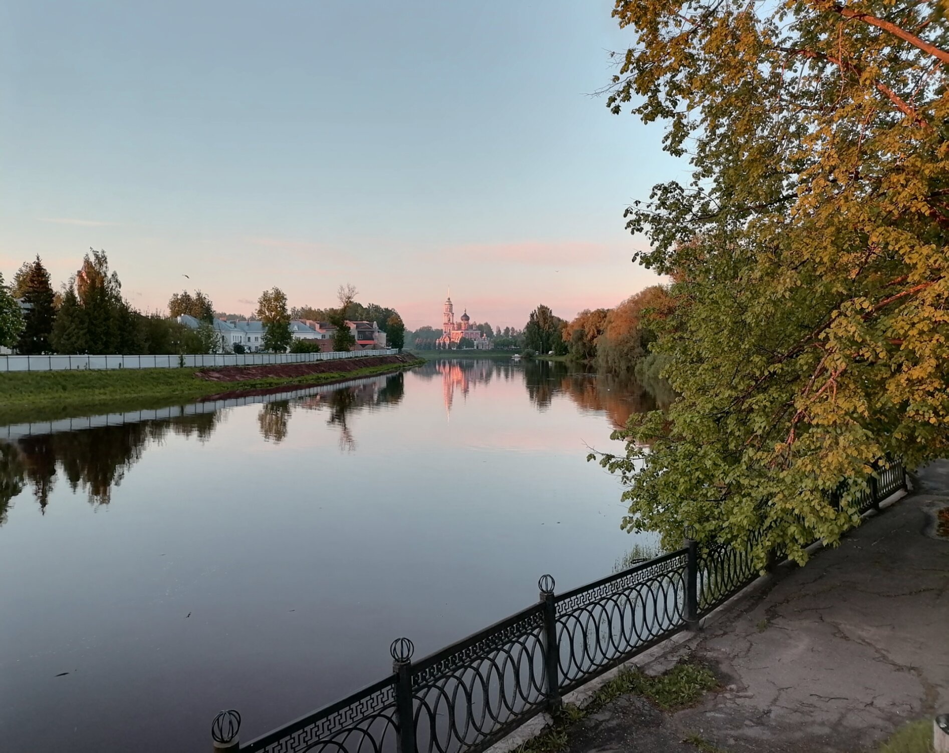 Фотография передаёт не только архитектурную красоту, но и тихую, умиротворяющую атмосферу, царящую на набережной реки Полисть. Мягкий свет, вероятно, утренний или вечерний, подчёркивает величие храма и создаёт настроение благочестивого созерцания, напоминая о глубоких православных традициях, которые хранит Старая Русса.