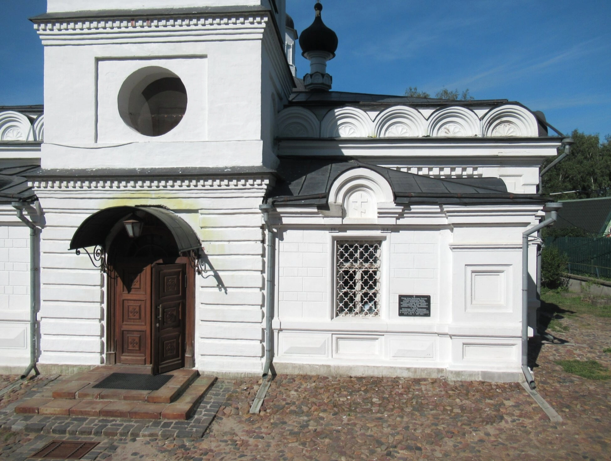 Центральное место на изображении занимает массивная деревянная дверь, ведущая в храм. Вход оформлен под сенью защитного металлического козырька и предваряется несколькими ступенями, символизирующими духовное восхождение верующих. На фасаде угадывается мемориальная доска, хранящая память о истории святого места.
