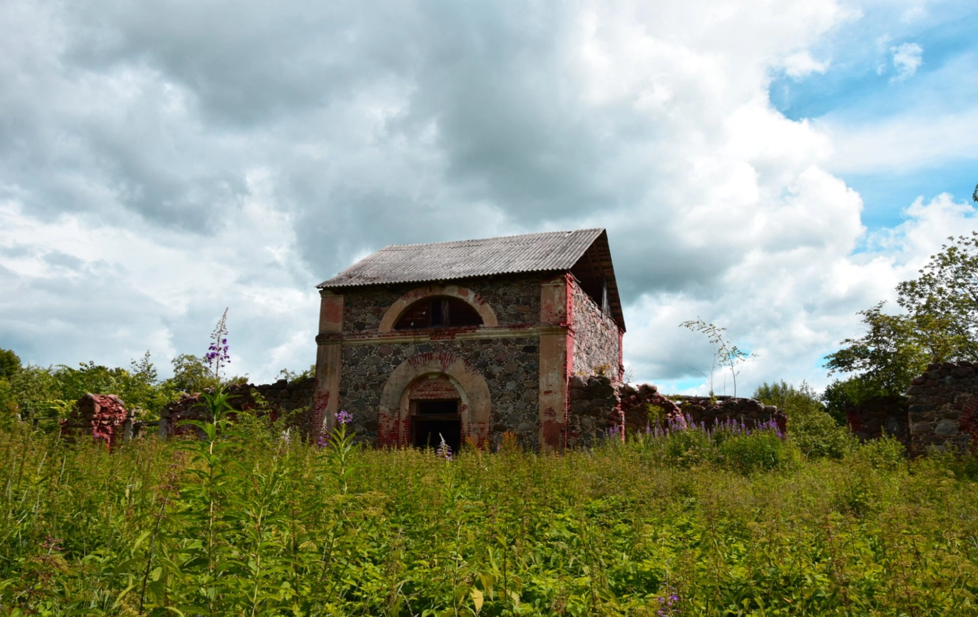 На фотографии запечатлены руины Церкви Воскресения Христова, расположенной в селе Торошковичи Лужского района Ленинградской области. Этот православный храм, являющийся памятником архитектуры регионального значения, был построен в начале XX века по проекту епархиального архитектора Николая Никонова, известного своими работами в русском стиле, включая Иоанновский женский монастырь в Петербурге.