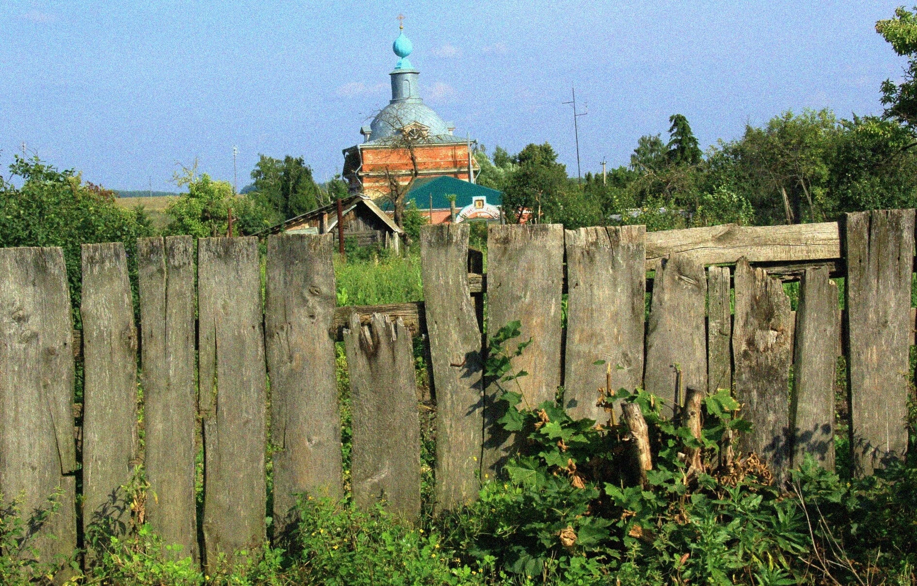 На переднем плане фотографии виднеется старинный деревянный забор, обрамляющий церковную территорию, и сочная зелёная растительность, подчёркивающая ухоженность и гармонию этого святого места. Храмовая колокольня, являющаяся неотъемлемой частью ансамбля, гордо устремляется в небесную высь, завершая архитектурный ансамбль.