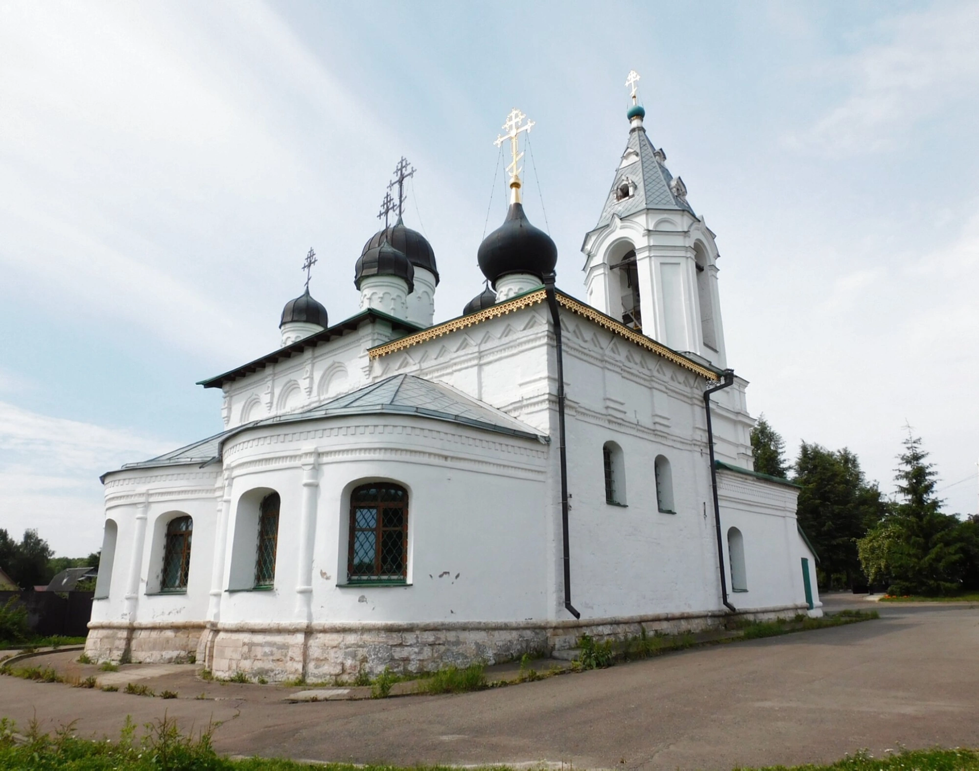 Белоснежный каменный храм является образцом русского церковного зодчества. Его архитектурный облик украшают несколько тёмных куполов, увенчанных златоглавыми крестами, устремлёнными в небо. Высокая колокольня со шпилем и собственным куполом гармонично завершает ансамбль. Состояние здания свидетельствует о недавней реставрации: безупречно белые стены, тёмная кровля на куполах и золотые декоративные элементы создают торжественный и ухоженный вид.