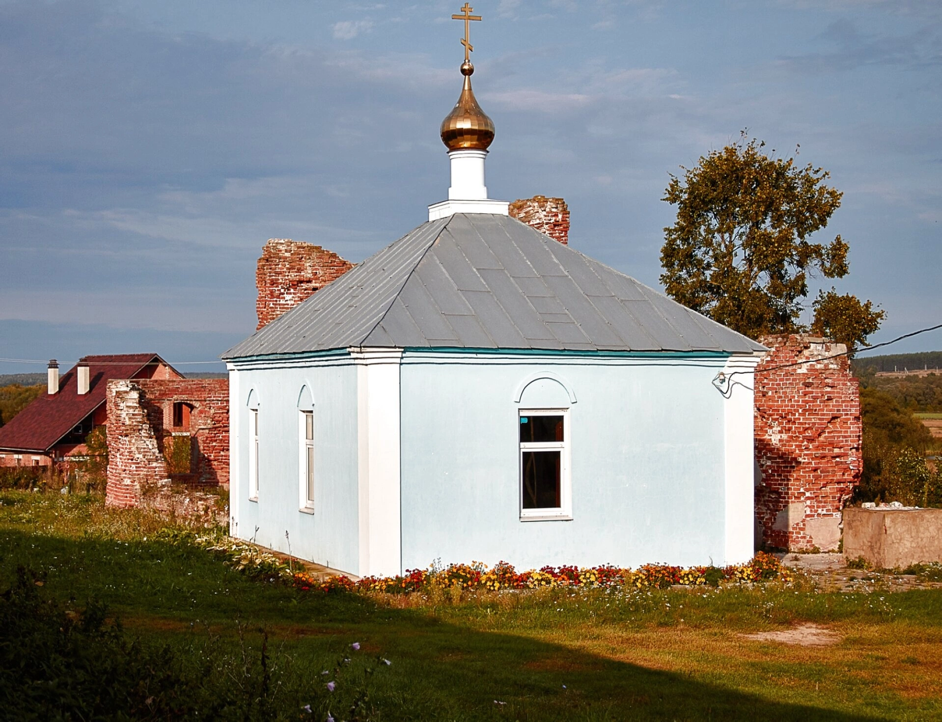 Окружает церковь ухоженная территория: зелёный газон, аккуратные цветники, а на заднем плане читается типичный для среднерусской полосы пейзаж с деревьями и скромными сельскими строениями. Общий вид излучает спокойствие и умиротворение, характерные для намоленных мест.