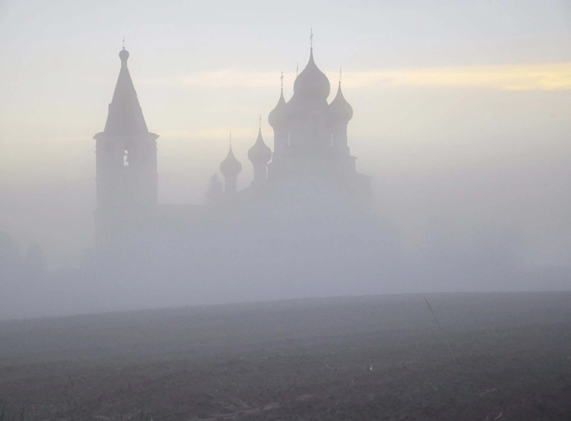 Туман, скрывающий основание храма и окружающие поля, символически отрешает его от земной суеты, направляя взор и мысль к небесам, куда устремлены золоченые кресты на сияющих главках. Мягкий, рассеянный свет пасмурного дня и приглушенная гамма серых и перламутровых оттенков создают настроение тишины, благоговения и вечности. Этот образ словно напоминает о нетленной красоте православной веры, которая, подобно этому храму, пережившему годы запустения, вновь возродилась для молитвы.