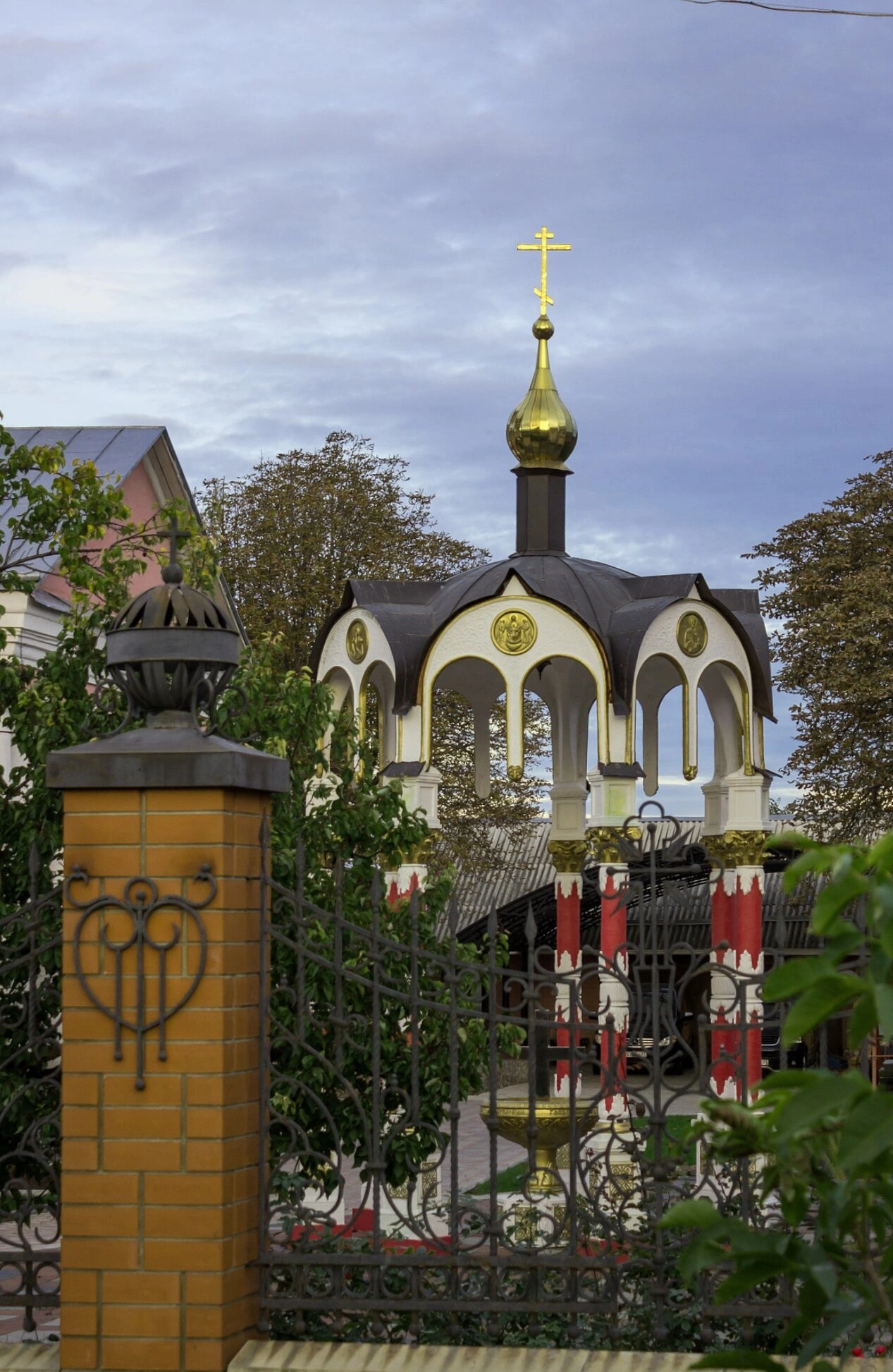 Храм окружён благоустроенной территорией, ограждённой ажурной кованой оградой с кирпичными столбами. На переднем плане фотографии виден один из таких столбов, украшенный изящным кованым элементом в форме сердца, что символизирует любовь и милосердие. Пышная зелень деревьев и кустарников, обрамляющая храм, создаёт ощущение уюта, покоя и гармонии между творением рук человеческих и природной красотой.