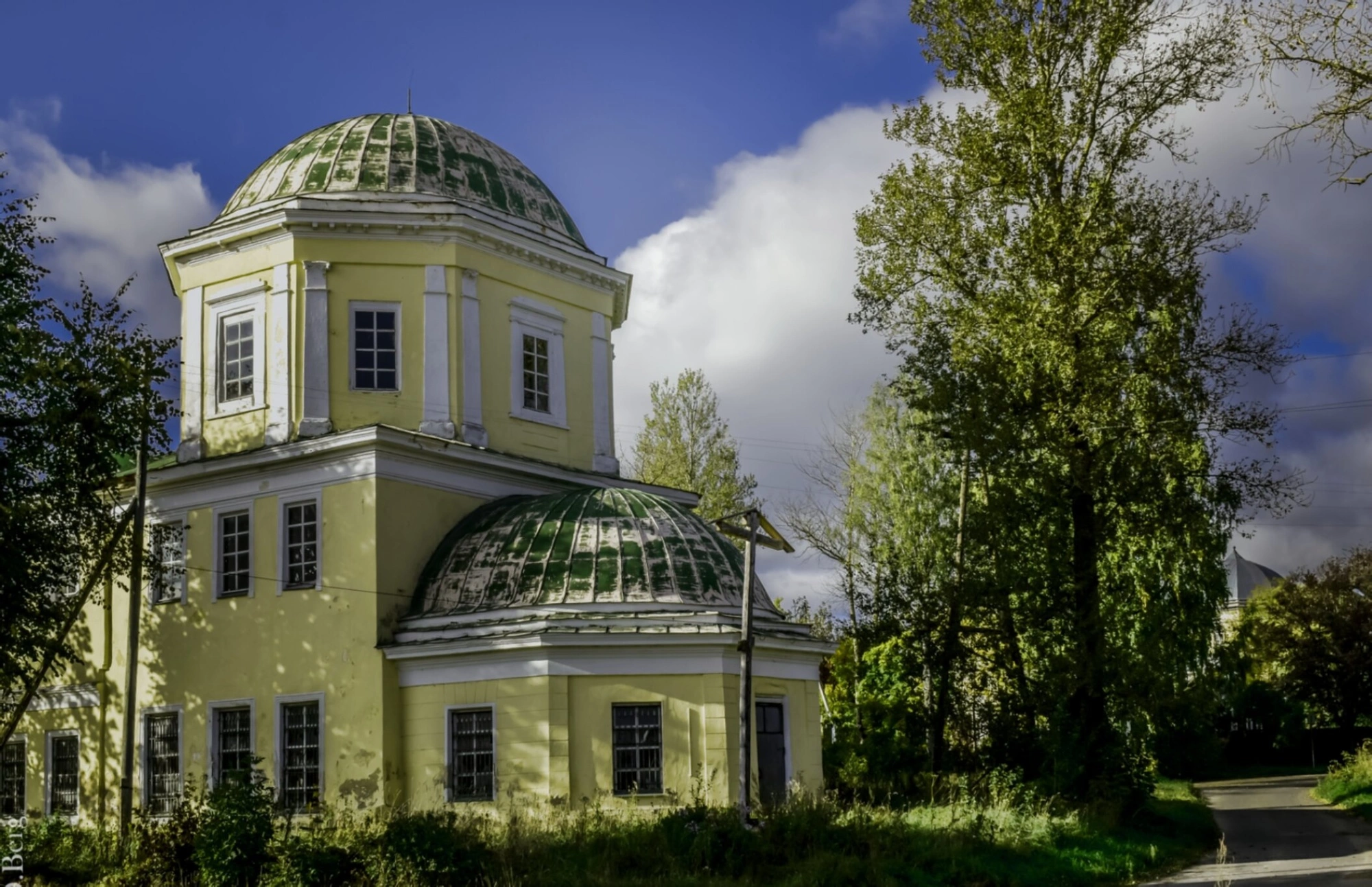 На представленной фотографии запечатлён величественный образ Церкви Воздвижения Честного и Животворящего Креста Господня, что располагается в древнем граде Торжке Тверской области. Этот храм является выдающимся памятником церковной архитектуры и духовным центром, освящённым в честь одного из двенадцати великих православных праздников.