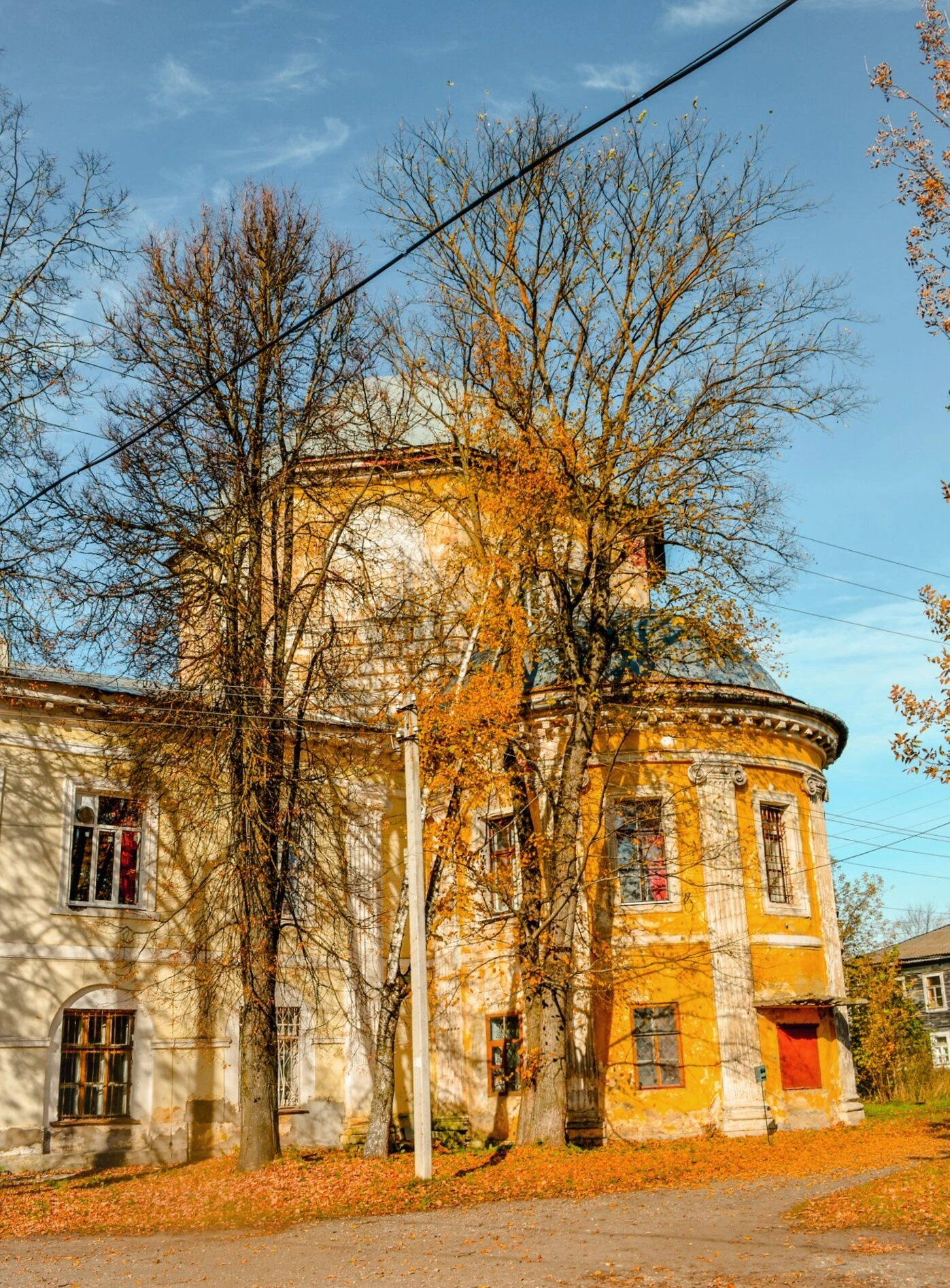 На представленной фотографии запечатлена Церковь Воздвижения Честного Креста Господня, являющаяся частью ансамбля Воскресенского женского монастыря в древнем городе Торжке Тверской области. Храм, изображенный в погожий осенний день, представляет собой прекрасный образец русской церковной архитектуры.