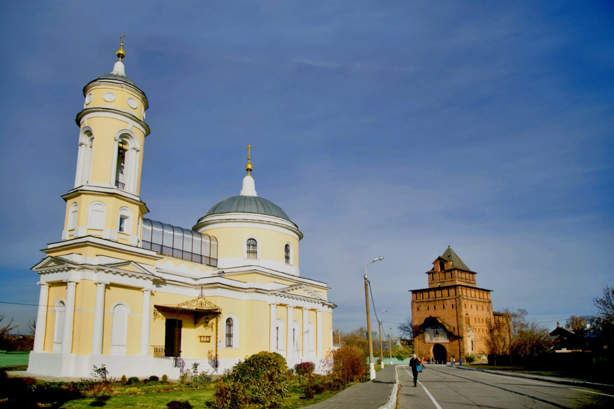 На представленной фотографии запечатлён живописный вид в историческом центре Коломны, где гармонично соседствуют православная святыня и древнее крепостное сооружение — Церковь Воздвижения Честного и Животворящего Креста Господня и Маринкина башня Коломенского кремля.