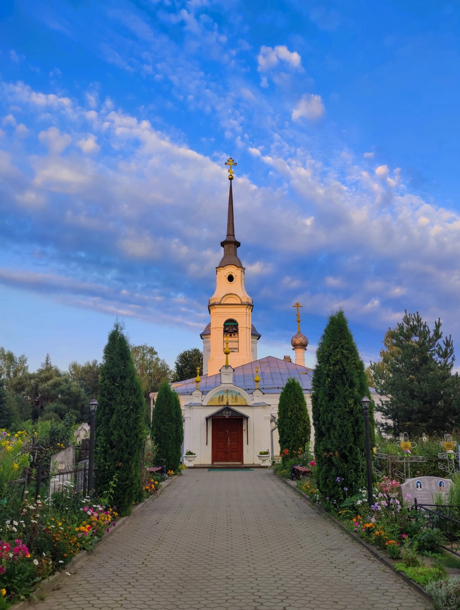 К храму ведёт аккуратно мощёная дорожка, обрамлённая с обеих сторон подстриженными хвойными деревьями, что создаёт ощущение ухоженности и благолепия. Вокруг дорожки и у подножия церковных стен разбиты цветочные клумбы, пестрящие яркими красками летнего цветения. На заднем плане фотографии просматриваются элементы, характерные для церковного погоста, что указывает на расположение храма в намоленном историческом месте.