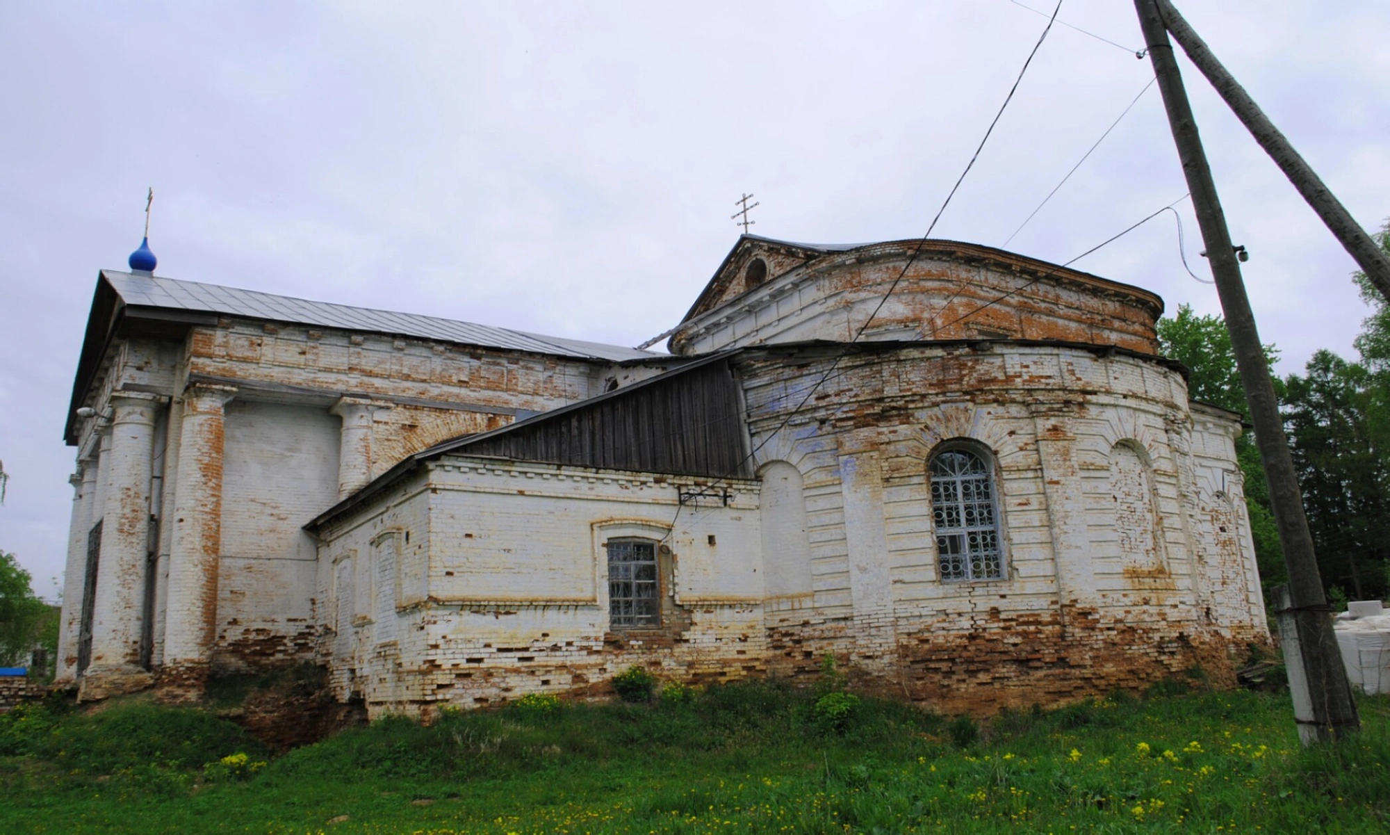 На фотографии отсутствуют люди, крупным планом представлено исключительно архитектурное сооружение. Это позволяет сосредоточить внимание на деталях церковного здания, его конструктивных особенностях и текущем состоянии. Снимок служит ценным документом, фиксирующим современное положение памятника православной культуры, призывающим к сохранению этого уникального образца религиозного наследия Уральского региона.