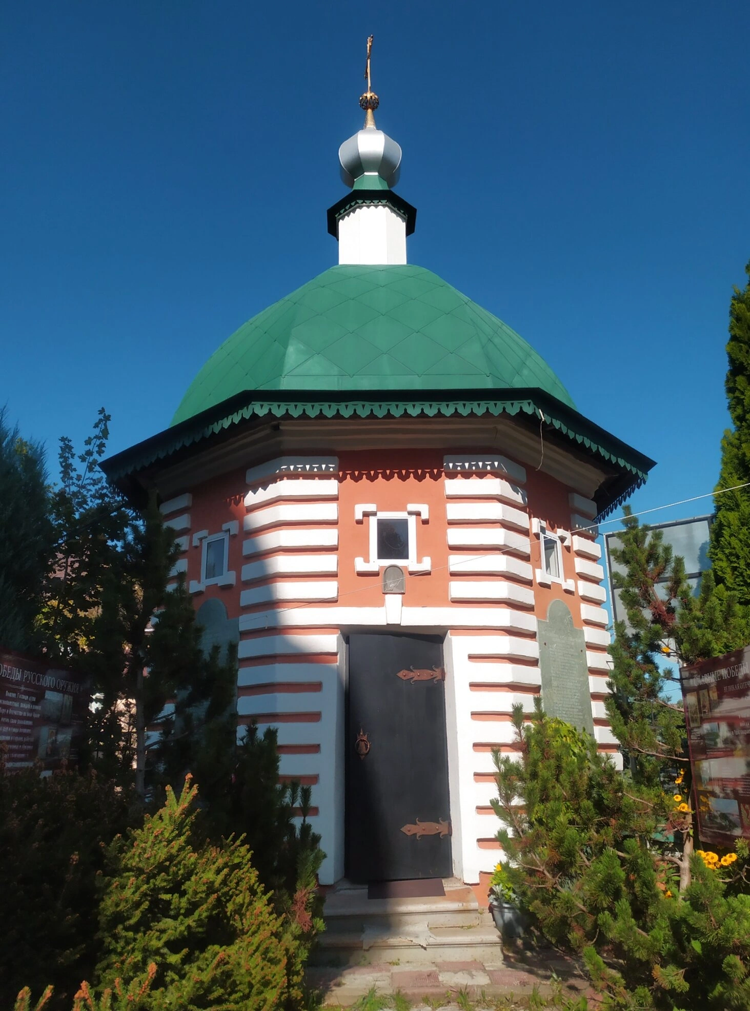 На фасаде чётко просматриваются прямоугольные оконные проёмы, обрамлённые наличниками, и массивная входная дверь тёмного цвета, ведущая в храмовое пространство. Церковь окружена ухоженной территорией с зелёными насаждениями, среди которых выделяются хвойные деревья, создающие особую атмосферу духовного уединения. К центральному входу ведёт аккуратно вымощенная дорожка.