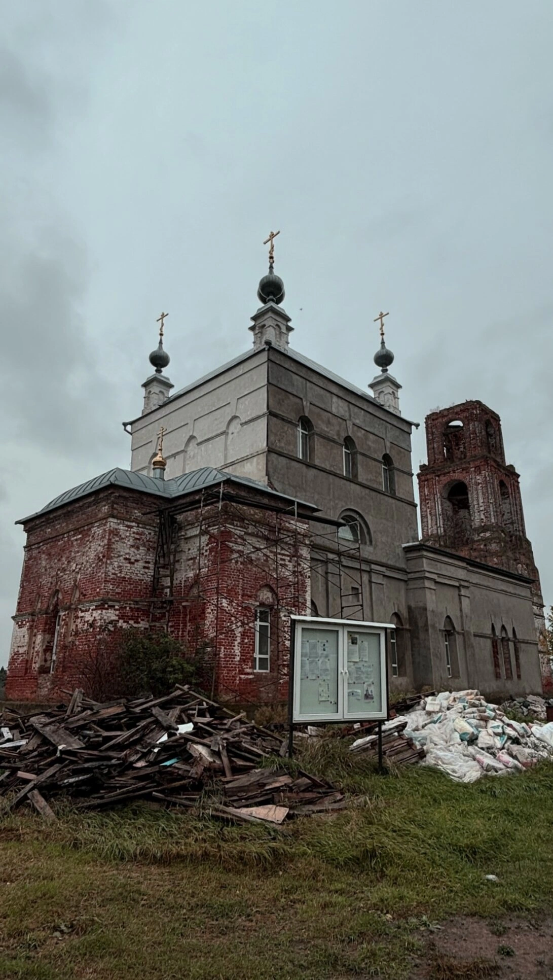 На снимке хорошо видно, что церковь находится в стадии активной реставрации. Центральный объём храма уже оштукатурен и подготовлен к покраске, тогда как колокольня и часть основного здания сохраняют первоначальную кирпичную кладку. Вокруг сооружения заметны строительные материалы и элементы благоустройства территории, что свидетельствует о продолжающихся восстановительных работах.