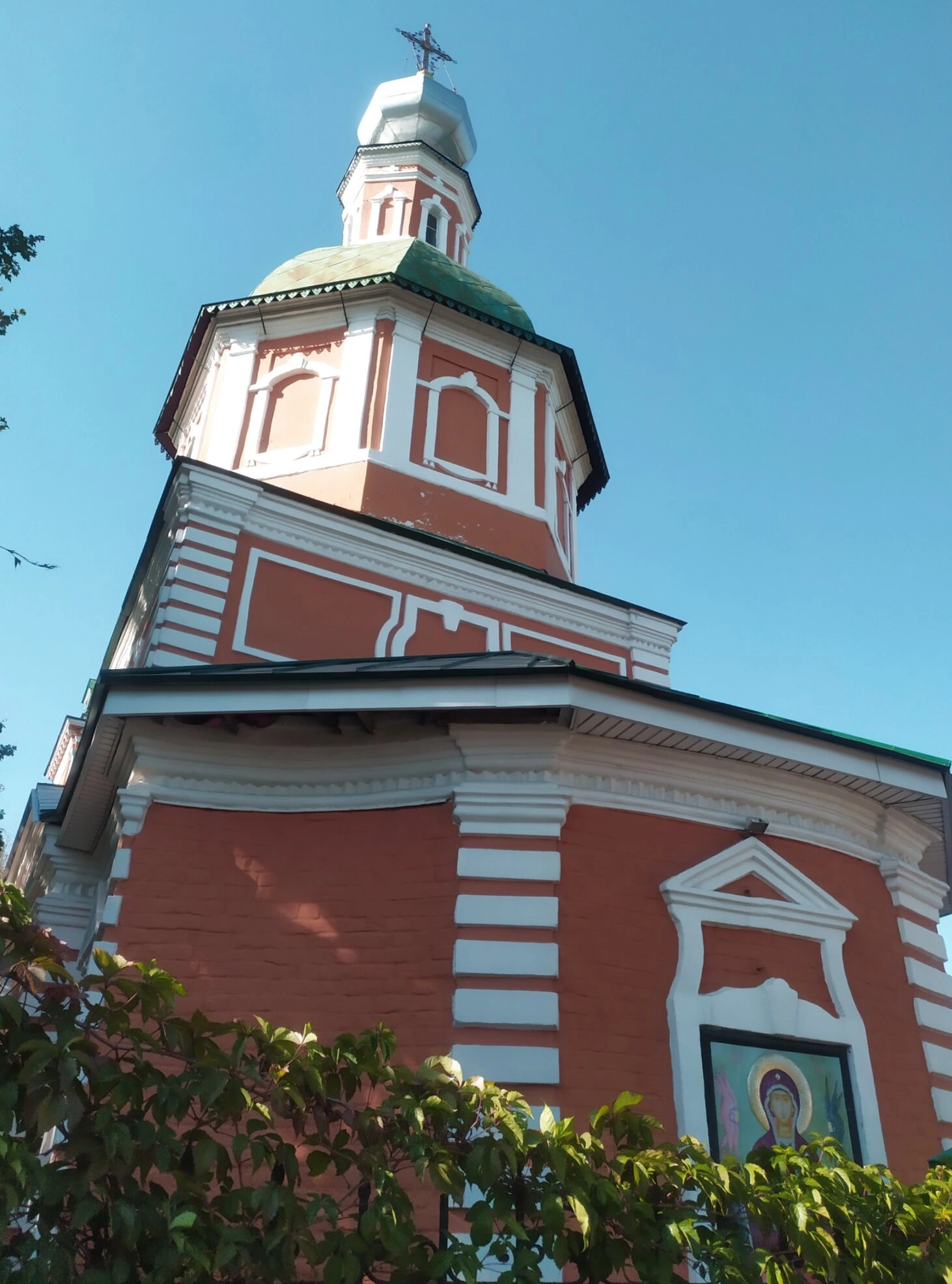 Двухъярусное здание храма с высокой колокольней демонстрирует гармоничные пропорции и изящество архитектурного решения. Стены церкви окрашены в теплый охристый цвет, что создает ощущение особого благолепия, а белоснежные архитектурные детали — наличники окон, пилястры и карнизы — контрастно выделяются на основном фоне, подчеркивая строгость и величие православного храма.