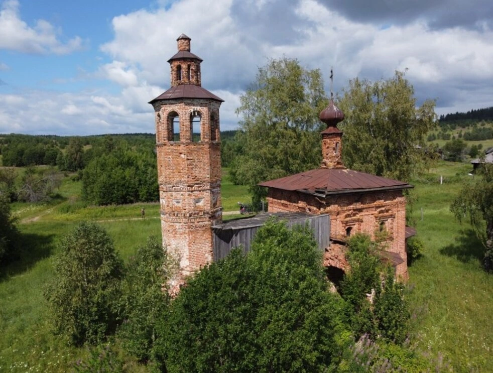 На представленной фотографии запечатлена Церковь Воздвижения Честного и Животворящего Креста Господня, расположенная в бывшем селе Верх-Боровая Соликамского района Пермского края. Снимок выполнен с высоты, что позволяет в полной мере оценить архитектурные особенности этого некогда величественного храмового комплекса и его гармоничное вписывание в окружающий ландшафт.