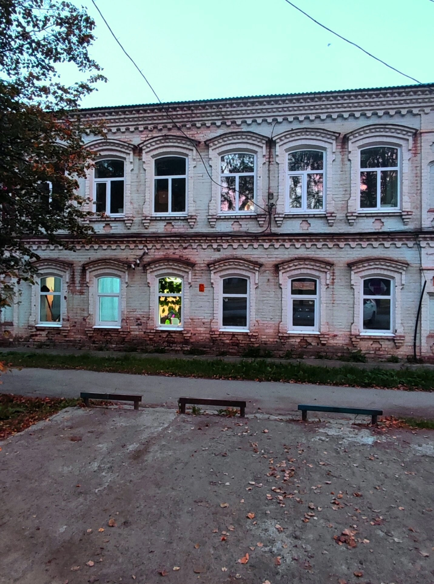 Внешний облик храма свидетельствует о его почтенном возрасте и сложной истории. Наблюдаются следы разрушения фасадной отделки, облупившаяся краска, некоторые оконные проемы заменены на современные стеклопакеты. Перед храмом расположена бетонная площадка с тремя скамейками, покрытая опавшими осенними листьями, что создает особую атмосферу уединенности и покоя.