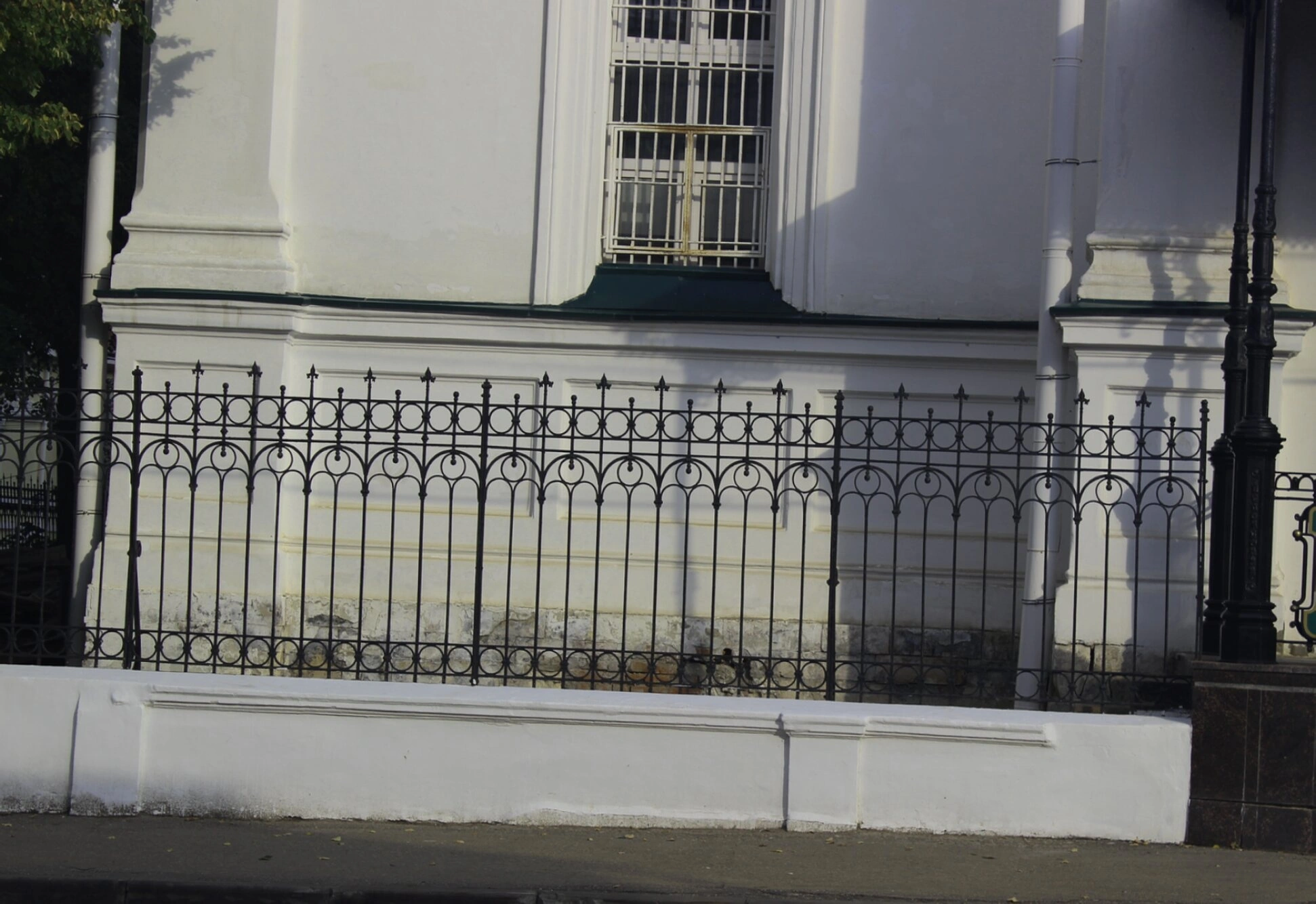 Особого внимания заслуживает изящная кованая ограда черного цвета, занимающая передний план фотографии. Ограда выполнена с применением традиционных методов художественной ковки и украшена декоративными элементами в виде арочных проемов и витиеватых завитков. Металлическая конструкция установлена на невысоком каменном цоколе из белого камня, что является типичным решением для храмовых ограждений периода классицизма.