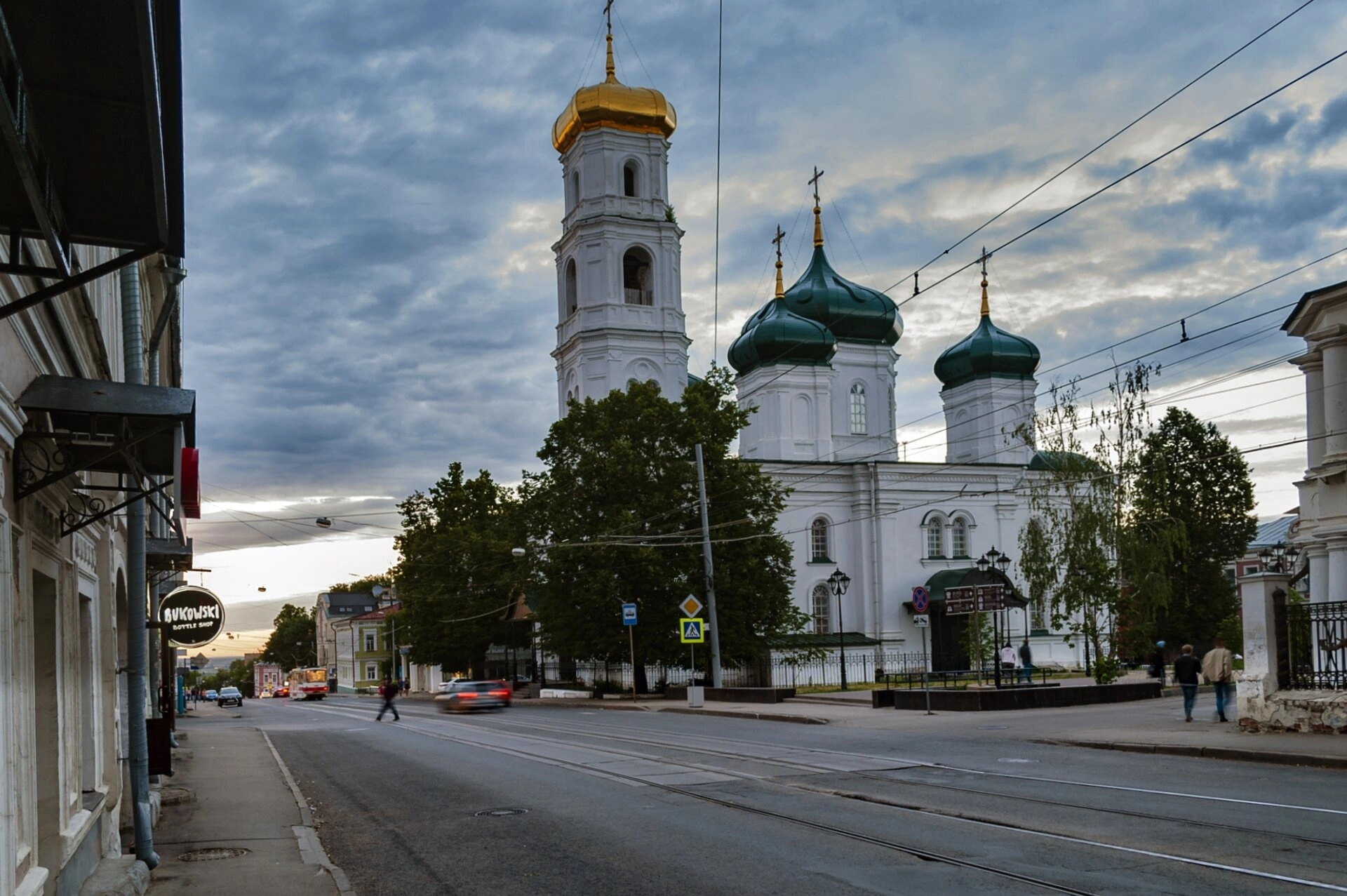 Святыня стоит на древнейшей улице города, где кипит современная жизнь: по левую сторону видны трамвайные пути и движущиеся автомобили, справа — пешеходный тротуар. Небесный свод, покрытый облаками, окутывает храм мягким светом, создавая атмосферу благоговения и спокойствия посреди городской суеты.
