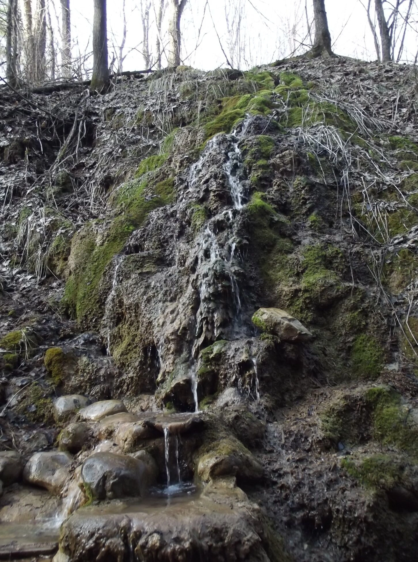 По склону струится небольшой ручей, образующий несколько каскадов и водопадов, чьи воды с тихим журчанием ниспадают вниз, собираясь в чистые лужицы меж камней. В верхней части композиции виднеются стройные стволы деревьев, чьи ветви простираются к небу подобно молитвенному воздению.