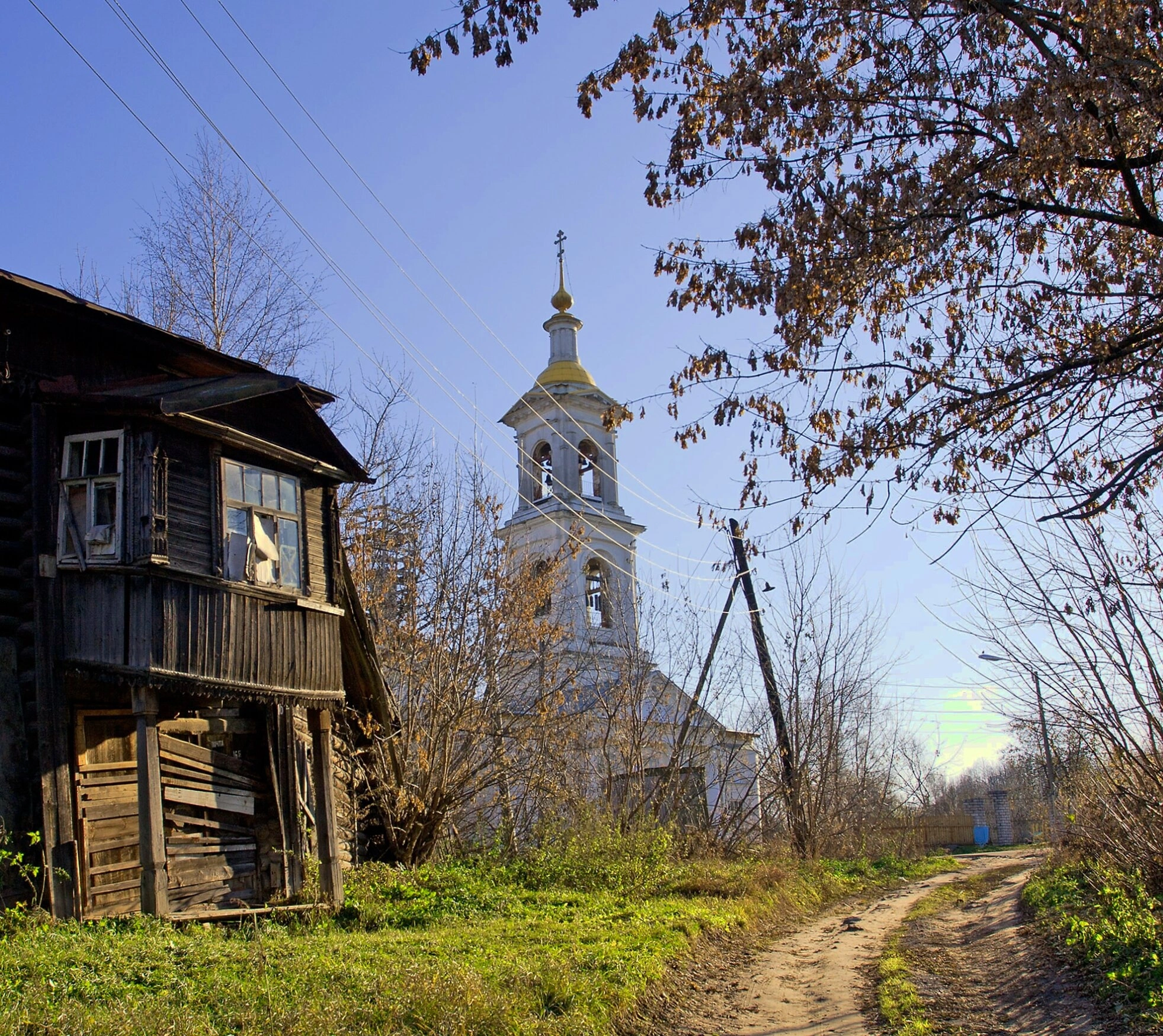 На переднем плане фотографии видна проселочная дорога, а рядом с храмом — старый деревянный дом, что подчёркивает исторический контекст и традиционный для русских городов пейзаж, где церковь является архитектурной доминантой.
