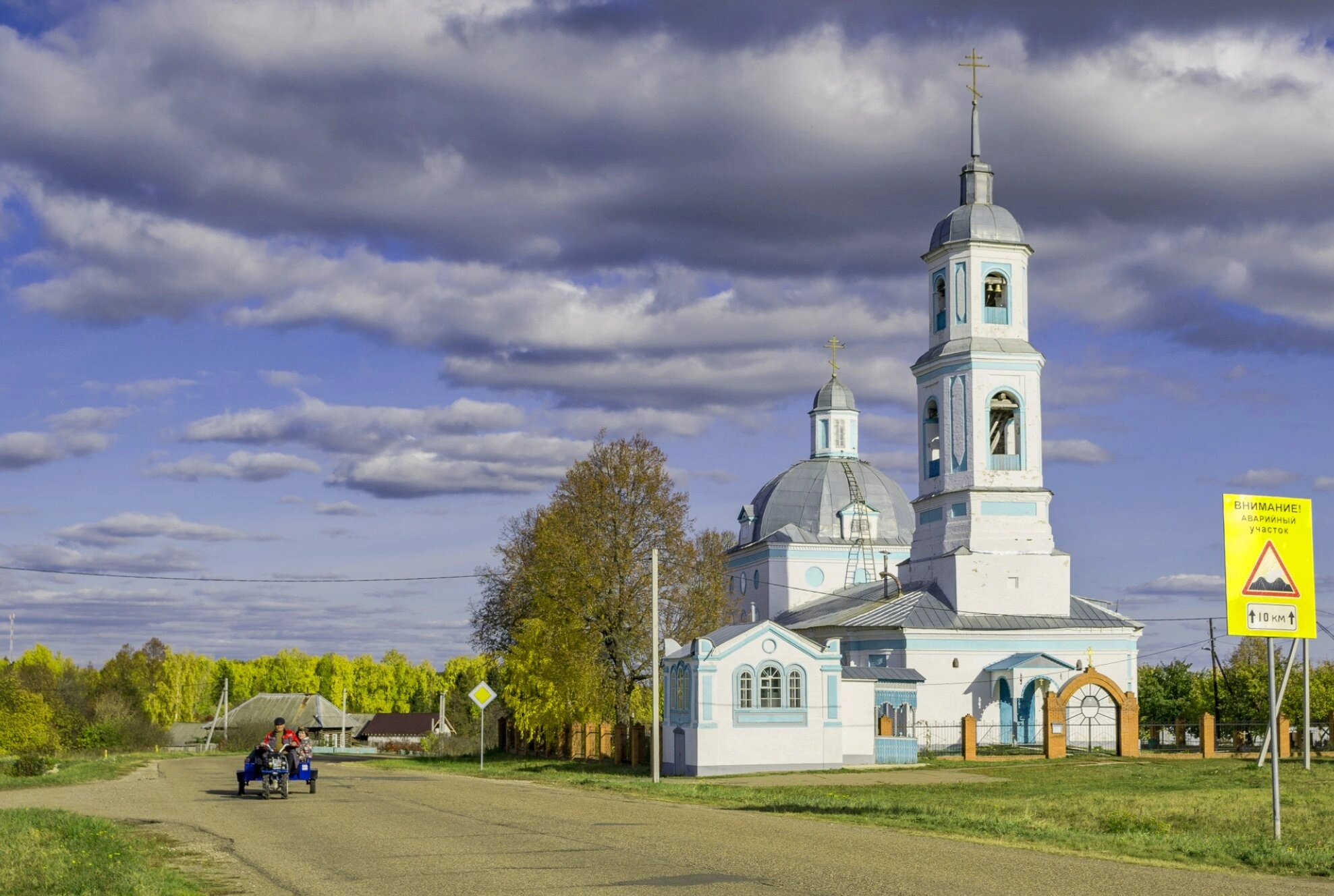 Перед храмом проходит грунтовая дорога, по которой движется конная повозка с двумя людьми, что добавляет снимку ощущение подлинности и связи с повседневной жизнью сельской местности. На обочине видны дорожные знаки, включая предупреждающий знак «ВНИМАНИЕ» с указанием особенностей пути.