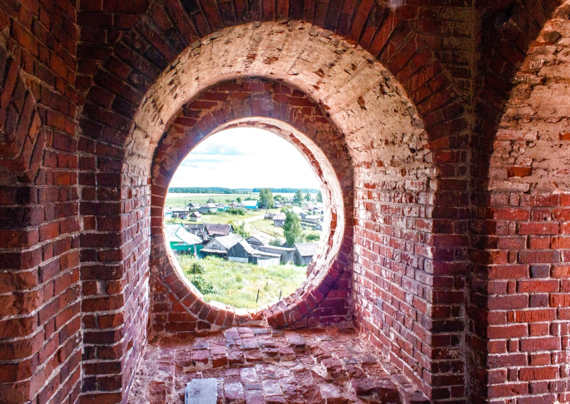 На представленной фотографии запечатлён уникальный вид изнутри Церкви Вознесения Господня, что расположена в селе Ратово Нижегородской области. Через величественное круглое арочное окно, характерное для православной храмовой архитектуры, открывается благодатный вид на окружающий храм сельский пейзаж. Священное пространство храма, обрамлённое кирпичной кладкой старинной постройки, создаёт особую атмосферу молитвенного уединения.