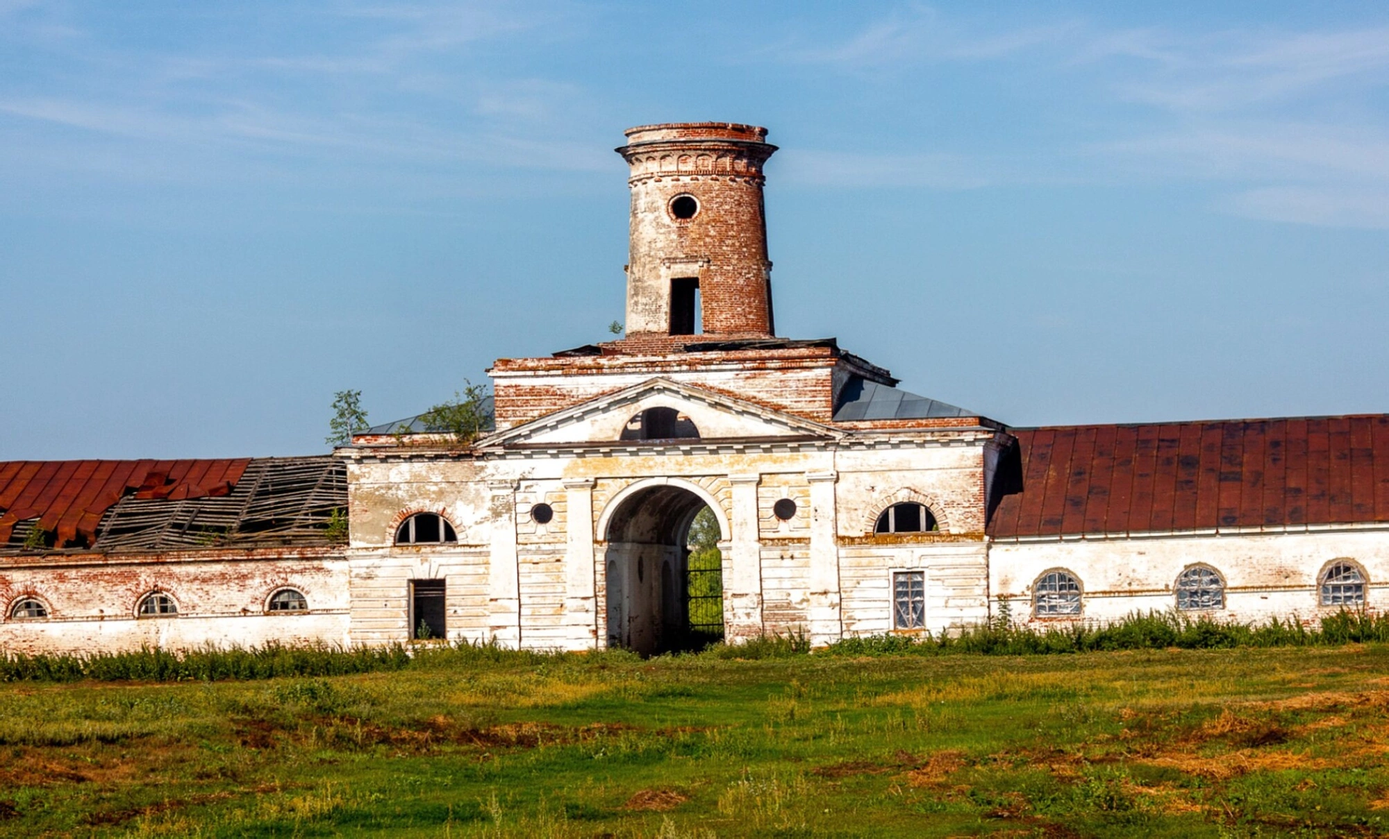 На переднем плане фотографии видна въездная башня усадебного комплекса, с западной стороны от которой открывается вид на саму церковь. Эта башня, являющаяся важным элементом усадебной инфраструктуры, представляет собой кирпичное сооружение с арочным проездом и декоративным оформлением в едином стиле с храмом.