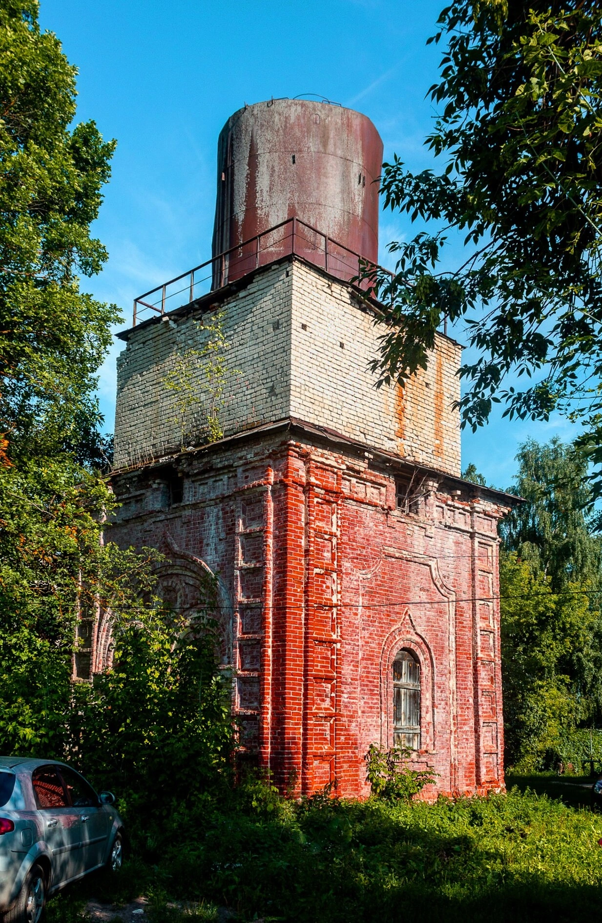 Верхняя часть здания, вероятно, была перестроена в более поздний период и выполнена из белого кирпича. Особенностью данного сооружения является металлический цилиндрический резервуар, венчающий строение, который был установлен в советский период и служил в качестве водонапорной башни после закрытия храма.