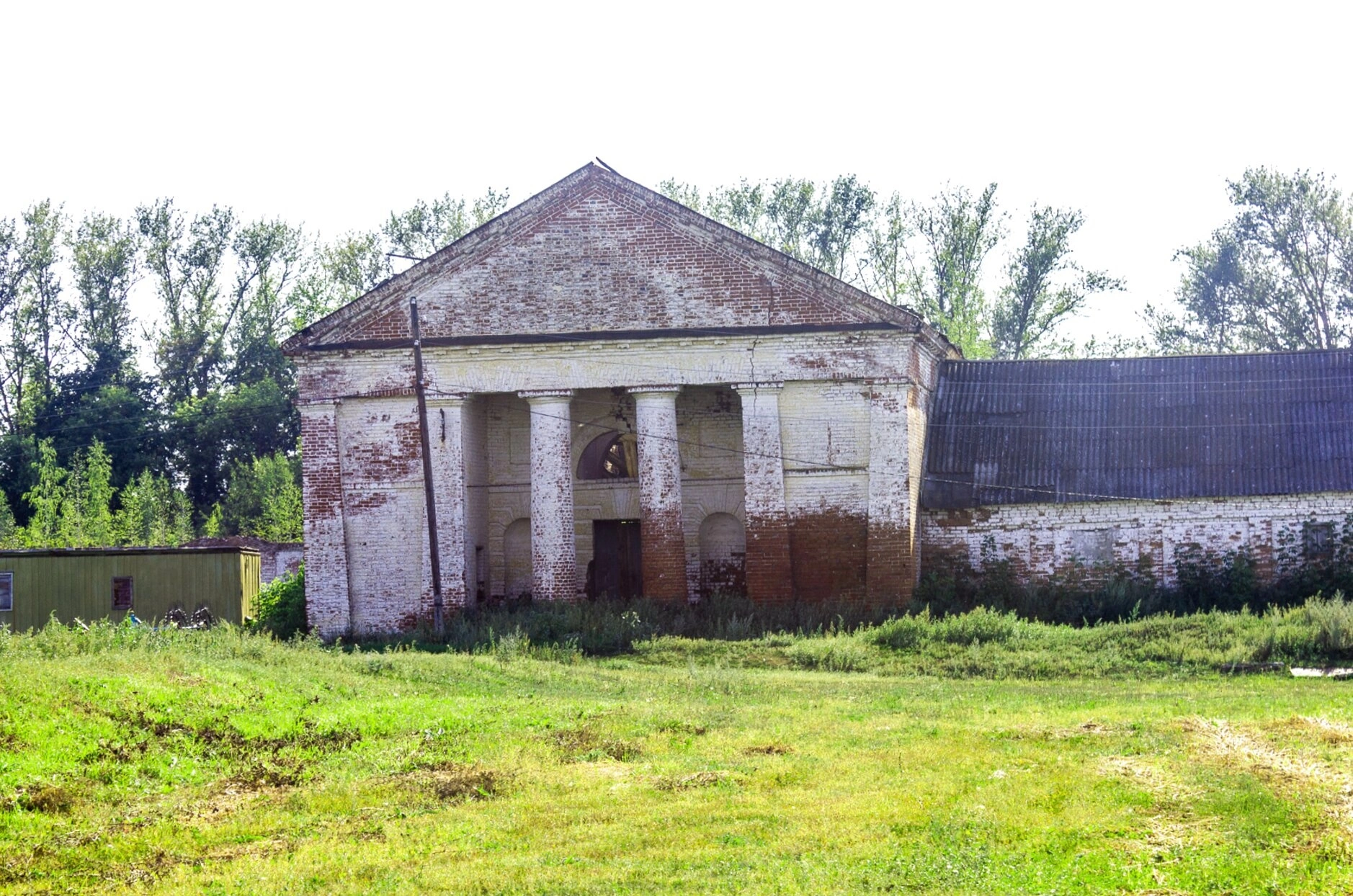 Территория вокруг храма заросла травой и деревьями, что подчёркивает заброшенность места. Слева от церкви видна небольшая хозяйственная постройка. Несмотря на разруху, в облике храма ещё угадываются благородные черты классицизма: строгие пропорции, колонны на главном фасаде и фронтон.