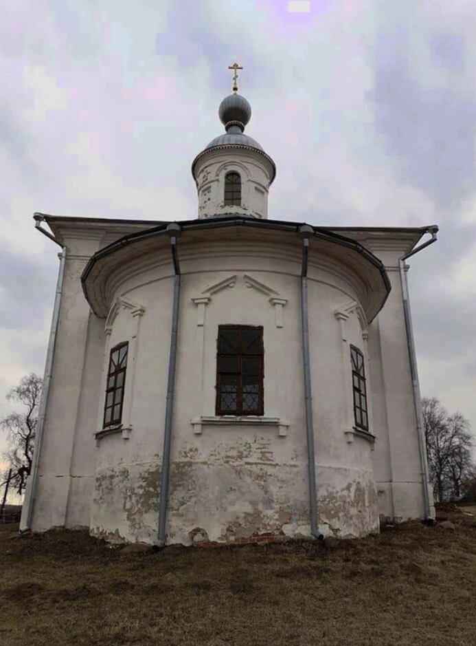 Апсида храма украшена тремя высокими арочными окнами, которые не только обеспечивают естественное освещение алтарной части, но и несут глубокую духовную символику, олицетворяя Святую Троицу. Фотография сделана в пасмурный день, когда серое небо создаёт особое настроение, подчёркивая величие и духовную значимость православной святыни.
