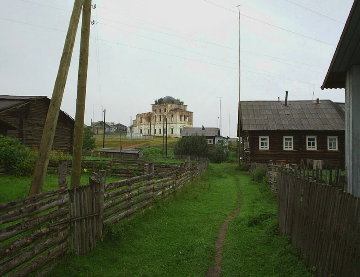 На переднем плане фотографии видна узкая тропинка, пролегающая между деревянными заборами, которая ведет к святыне. По обеим сторонам от тропы расположены традиционные деревянные дома, составляющие единый ансамбль с церковью. Небо, покрытое облаками, создает особую атмосферу умиротворения, характерную для северных земель.