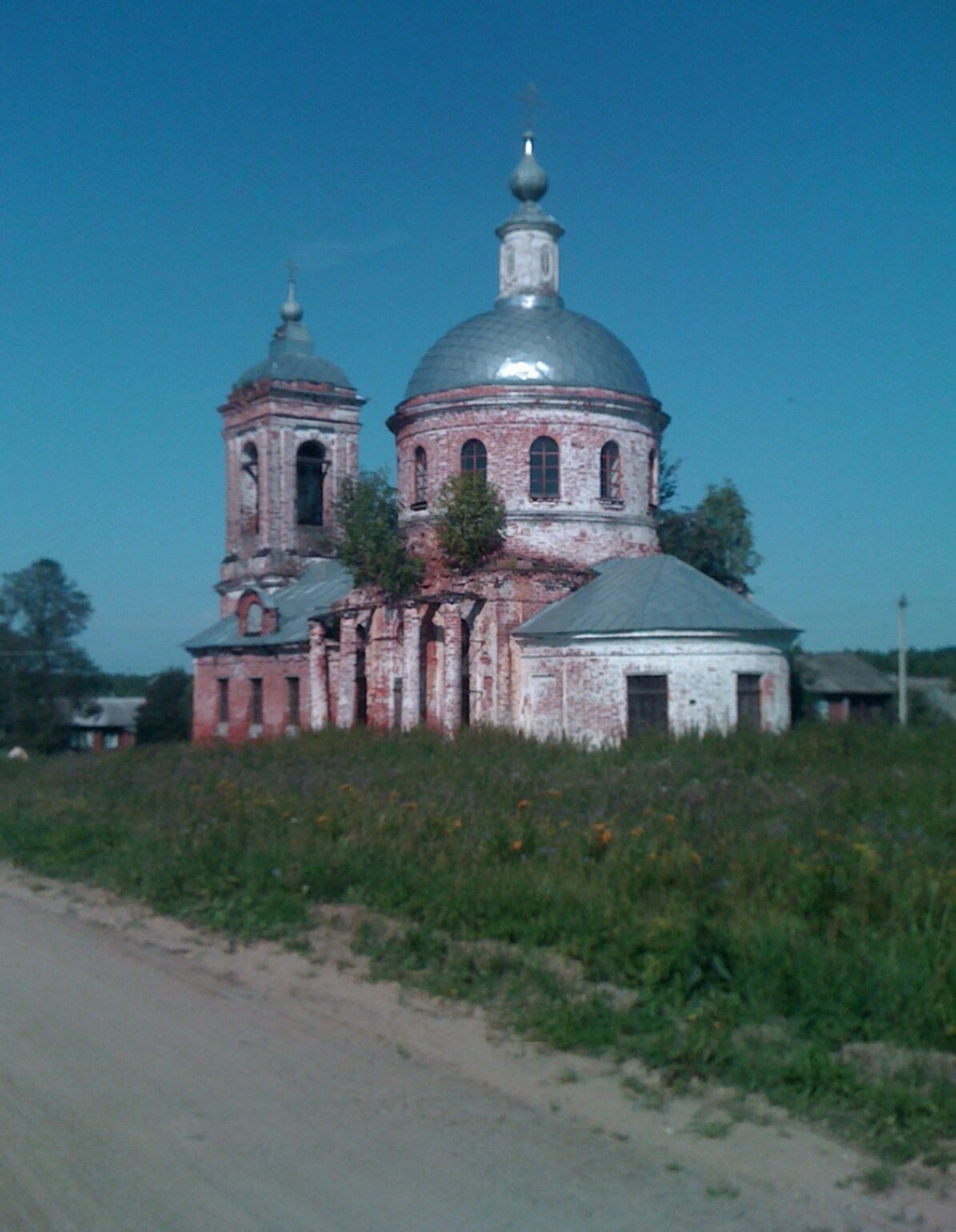 На заднем плане фотографии просматриваются сельские постройки, что подчёркивает расположение храма в жилой зоне. Чистое голубое небо над церковью создаёт контраст с печальным состоянием архитектурного памятника, напоминая о необходимости сохранения православного наследия России.