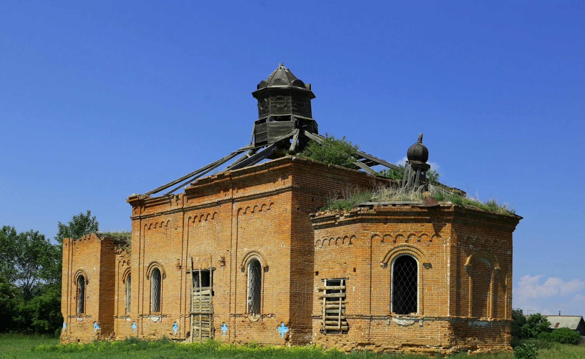 На представленной фотографии запечатлена полуразрушенная Церковь Вознесения Господня, расположенная в селе Локти Тюменской области. Храм выполнен из красного кирпича в традициях православной церковной архитектуры и находится в окружении природного ландшафта.