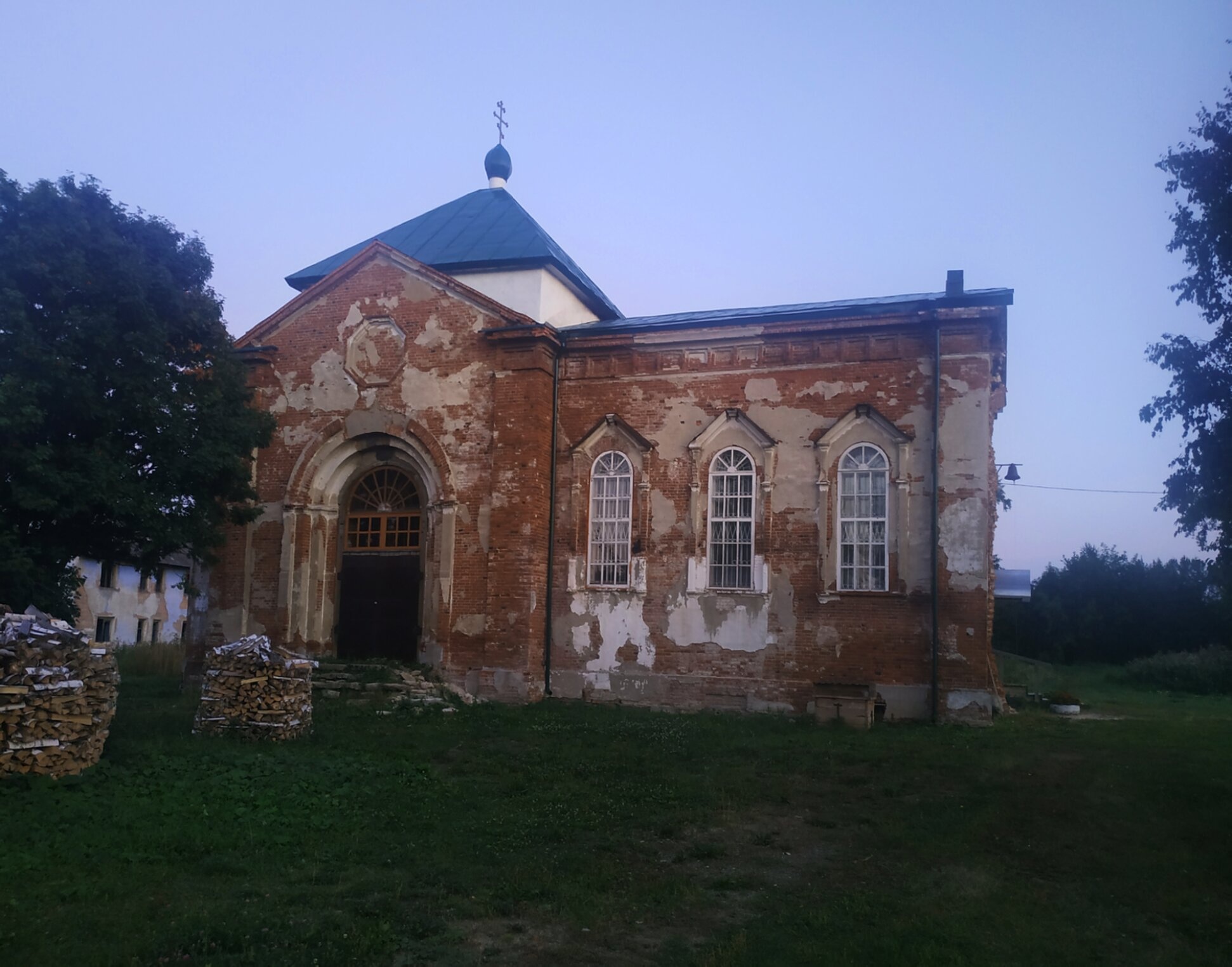 Нынешнее состояние церкви вызывает скорбь: кирпичная кладка местами обнажена, штукатурка осыпалась, элементы декора разрушаются под воздействием времени и непогоды. Однако даже в руинах сохраняется благодатная сила и строгая красота этого святого места. Окружающий пейзаж с травой, деревьями и аккуратно сложенной поленницей дров придаёт снимку особую melanchолию и ощущение забвения.