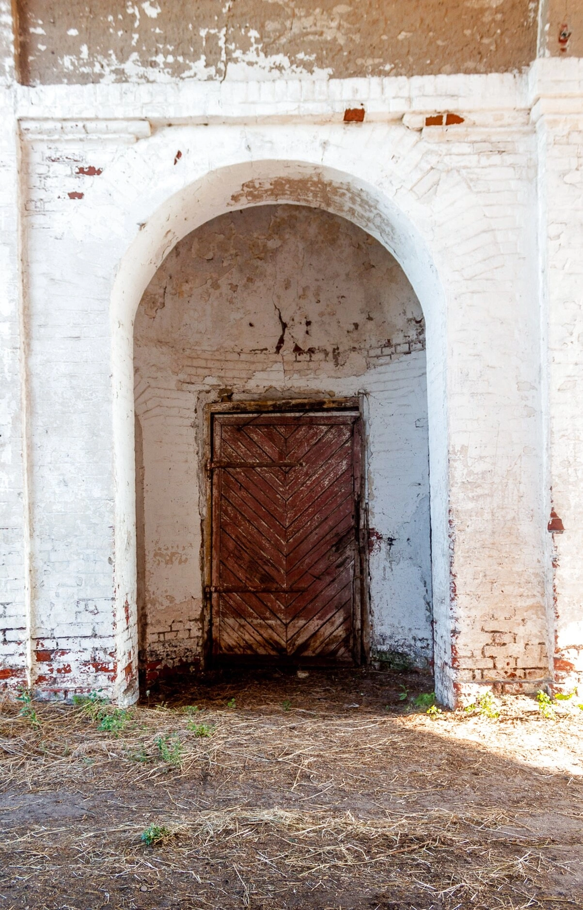 Центральным элементом композиции является высокий арочный проём, сложенный из кирпича и увенчанный благородными линиями свода. Его белоснежная штукатурка, местами обветшавшая, обнажает древнюю кирпичную кладку, что придаёт сооружению особую живописность и ощущение связи времён. В проёме арки располагается массивная деревянная дверь, собранная из диагональных досок, образующих традиционный узор «в ёлочку». Её поверхность, выцветшая под воздействием солнца и дождей, свидетельствует о многолетней истории этого святого места.