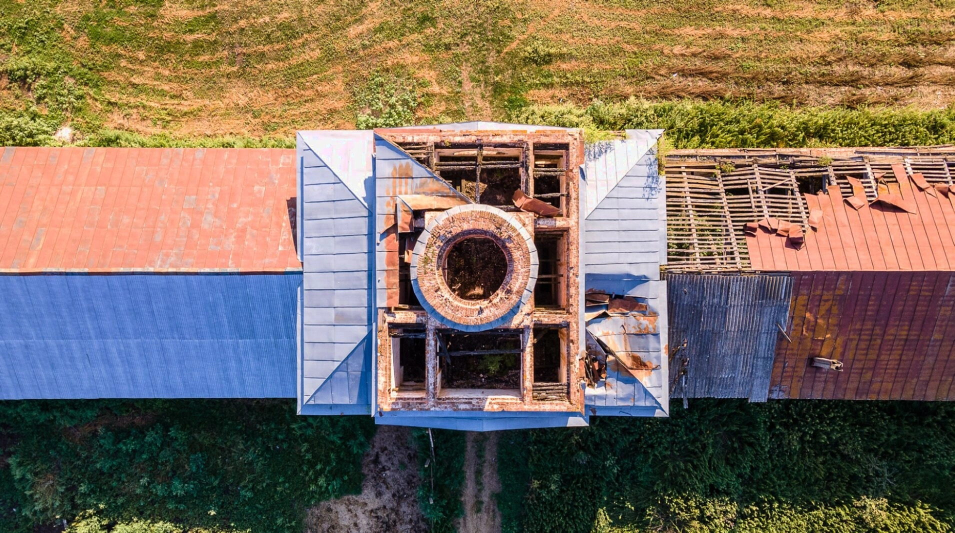 На представленной фотографии запечатлена Церковь Вознесения Господня, расположенная в селе Ратово Нижегородской области. Снимок выполнен с высоты птичьего полета, что позволяет оценить масштаб разрушения некогда величественного православного храма.