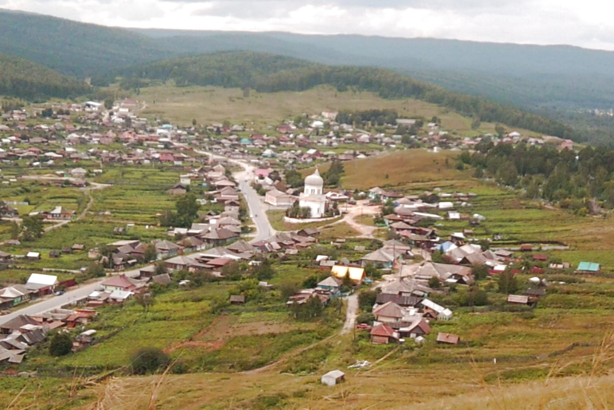 На представленной фотографии запечатлен живописный вид на село Сыростан, расположенное в Челябинской области, с главной архитектурной доминантой поселения — Церковью Вознесения Господня. Храм величественно возвышается на фоне уральского пейзажа, демонстрируя гармоничное сочетание духовного начала и природного окружения.