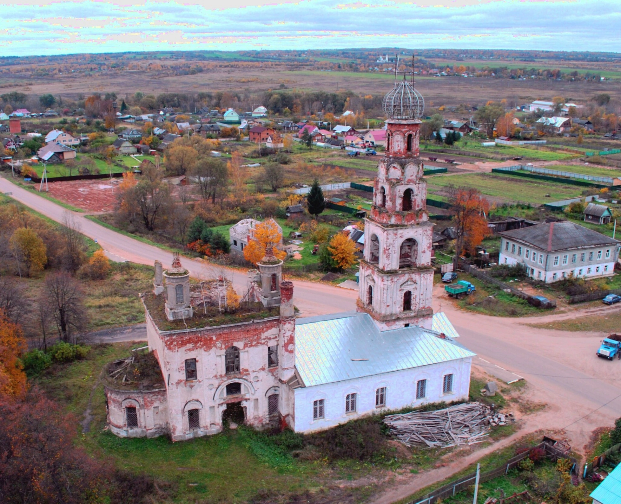 Церковь расположена на возвышенности в центре села, доминируя в окружающем пространстве. Осенний пейзаж с начинающей желтеть листвой создаёт особое настроение, подчёркивая уединённость и историческую значимость этого места. На заднем плане видны характерные для сельской местности просторы — поля и леса, а также современные жилые дома, что создаёт своеобразный диалог между прошлым и настоящим.